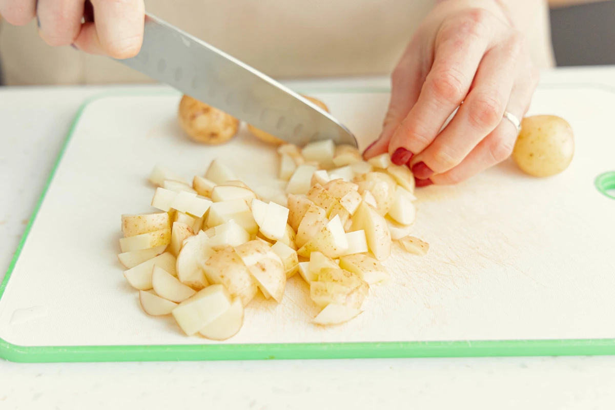 Молодую картошку помойте и потрите щёткой, нарежьте мелкими кубиками. Добавьте картошку в кастрюлю.