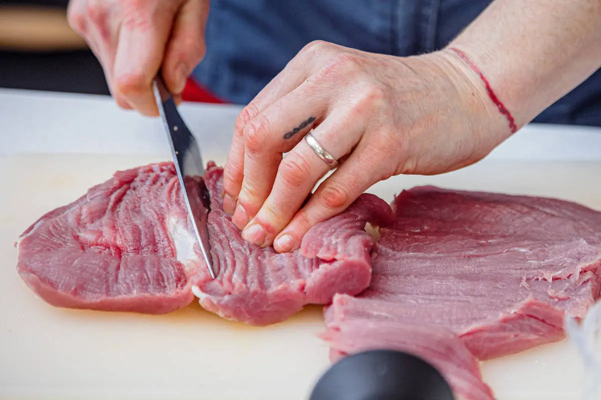 Вырезку разрежьте на 4 куска, аккуратными надрезами раскройте в пласт.