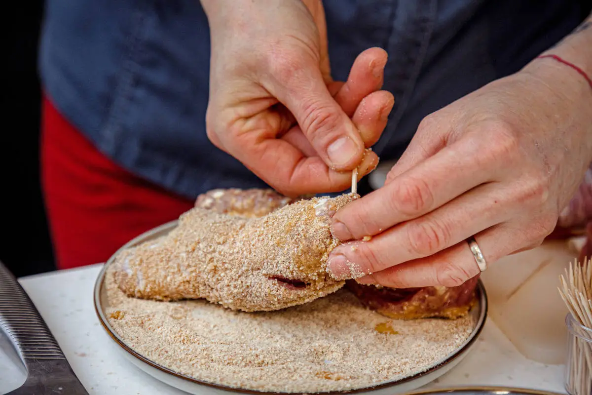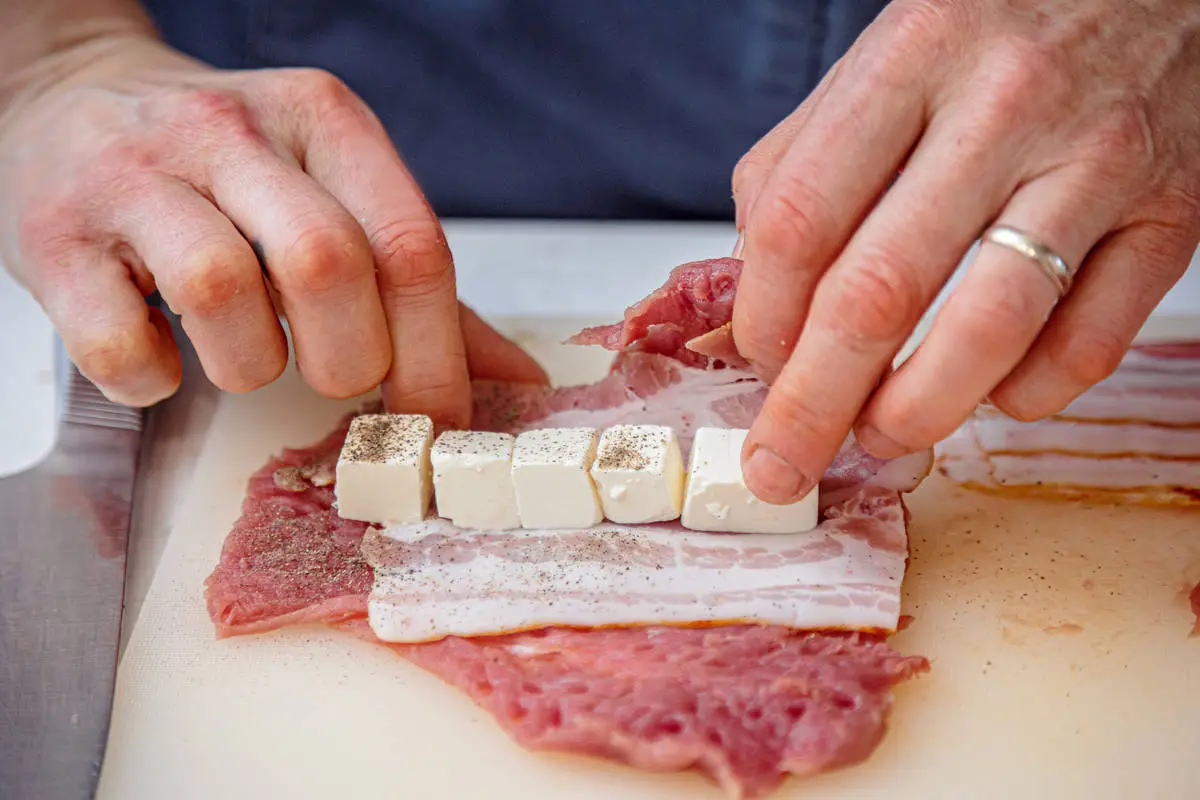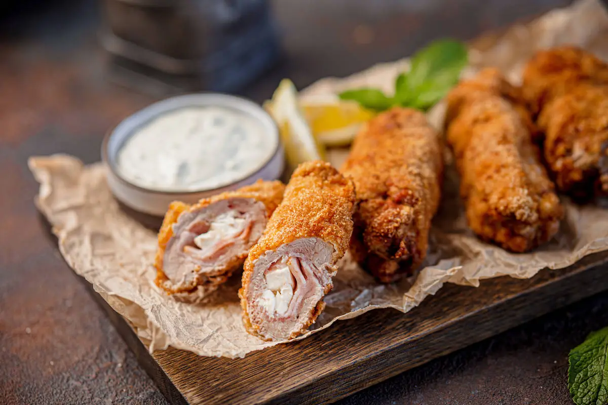 Шницель караджордже придумал сербский повар Мичи Стоянович. У него не оказалось под рукой сливочного масла и курицы для приготовления котлет по-киевски, и тогда он завернул шницель трубочкой, начинив его каймаком. А уже готовый шницель полил соусом тартар и украсил ломтиком лимона. А мы предлагаем свой вариант шницеля караджордже — без каймака, но с фетой и беконом.