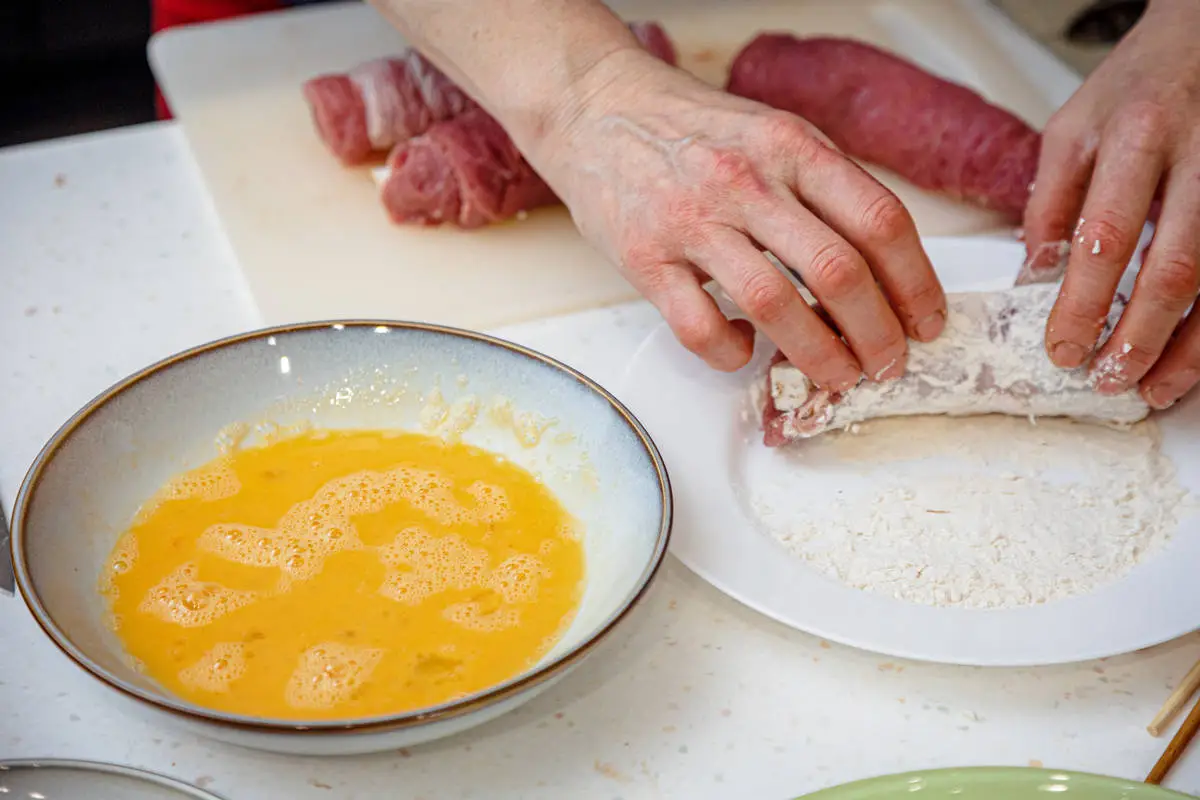 Подготовьте 3 мисочки: в первую насыпьте муку, во вторую разбейте яйца и перемешайте, в третью насыпьте сухари. Каждый рулет поочерёдно обваляйте в муке, обмакните в яичную смесь и затем обваляйте в сухарях.