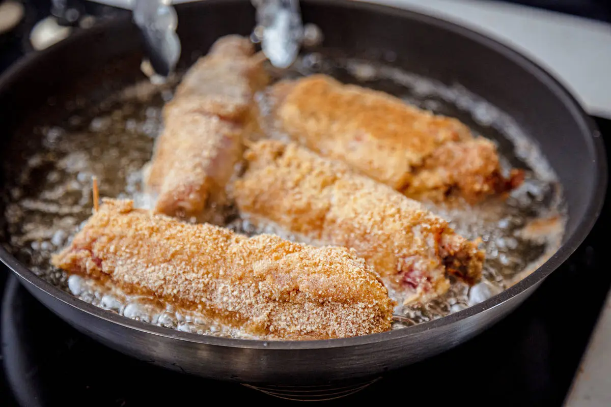 В глубокой сковороде разогрейте масло и обжарьте рулеты до золотистости (около 10 минут в кипящем масле). Готовые рулеты выложите на бумажные полотенца, чтобы впиталось лишнее масло.