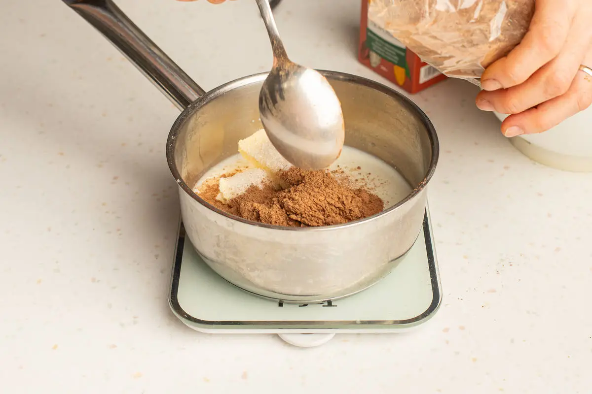 В кастрюльке или сотейнике соедините молоко со сливочным маслом, сахаром и какао.