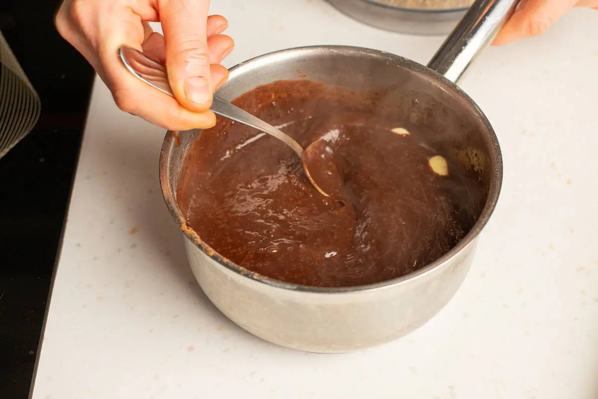 Нагрейте примерно до 80 °C, помешивая, пока все ингредиенты не соединятся в почти однородную массу.