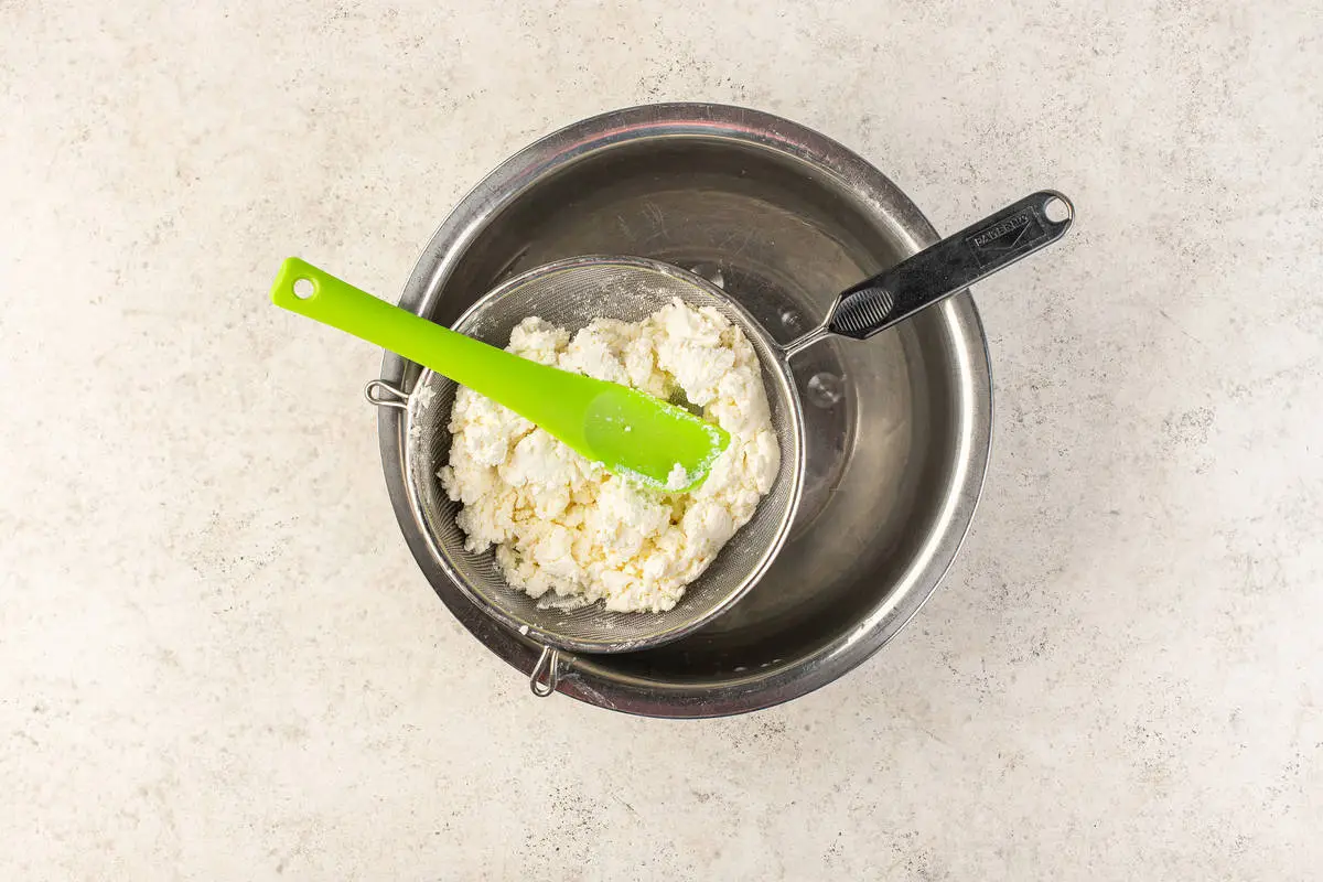 Творог протрите через сито (удобно делать это силиконовой лопаткой).