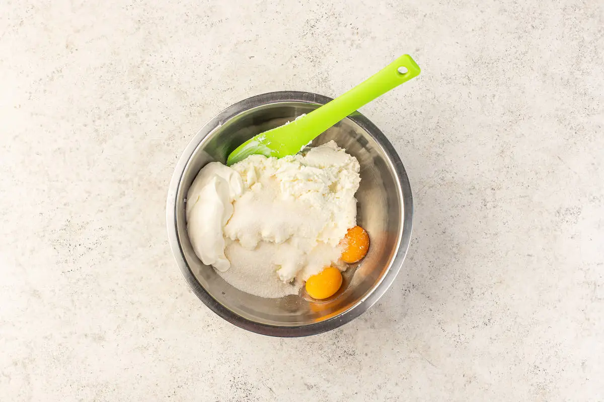 Добавьте желтки, сахар и сметану, тщательно перемешайте.