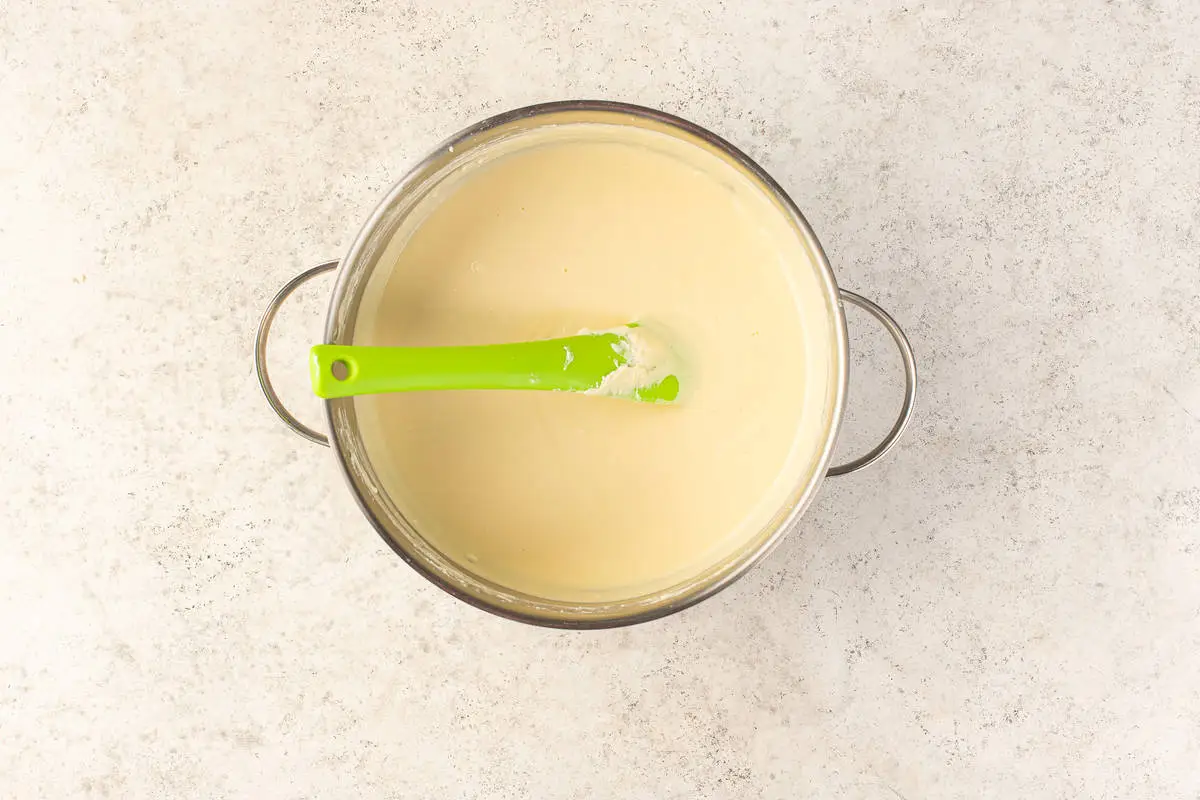 Переложите массу в кастрюлю и варите на медленном огне, постоянно помешивая, до первых пузырьков. Снимите с огня и оставьте остужаться, периодически помешивая.