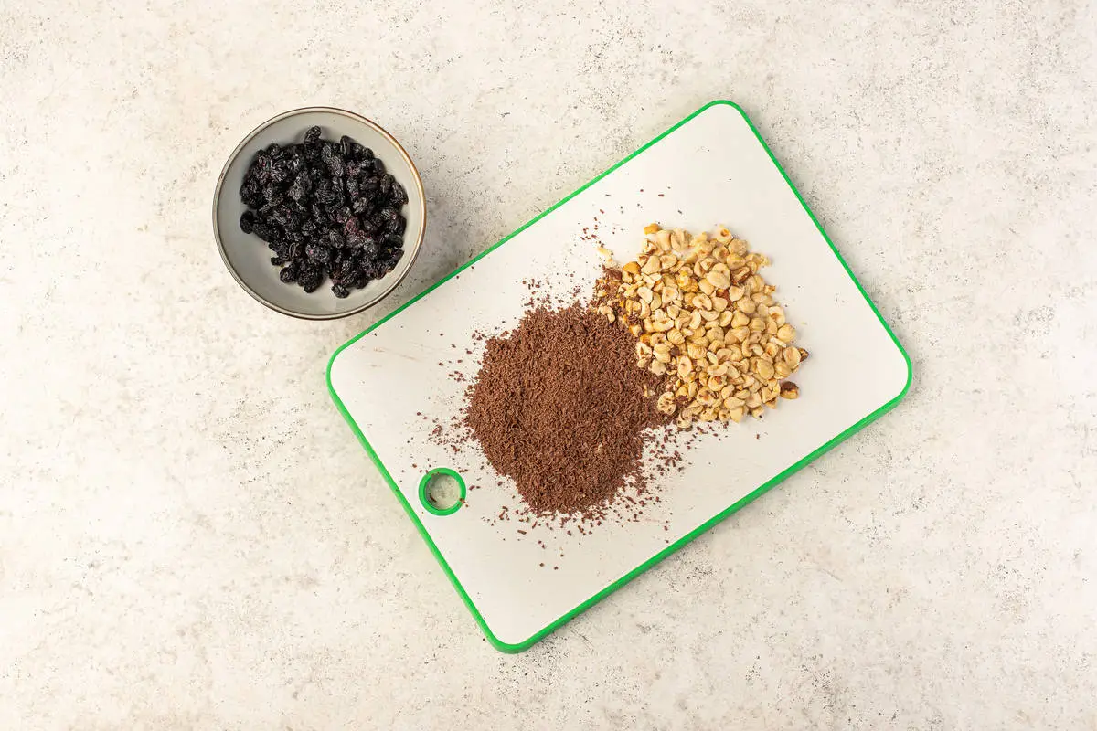 Изюм залейте кипятком, оставьте на 5 минут, затем слейте воду. Орехи крупно порубите, шоколад измельчите на тёрке.