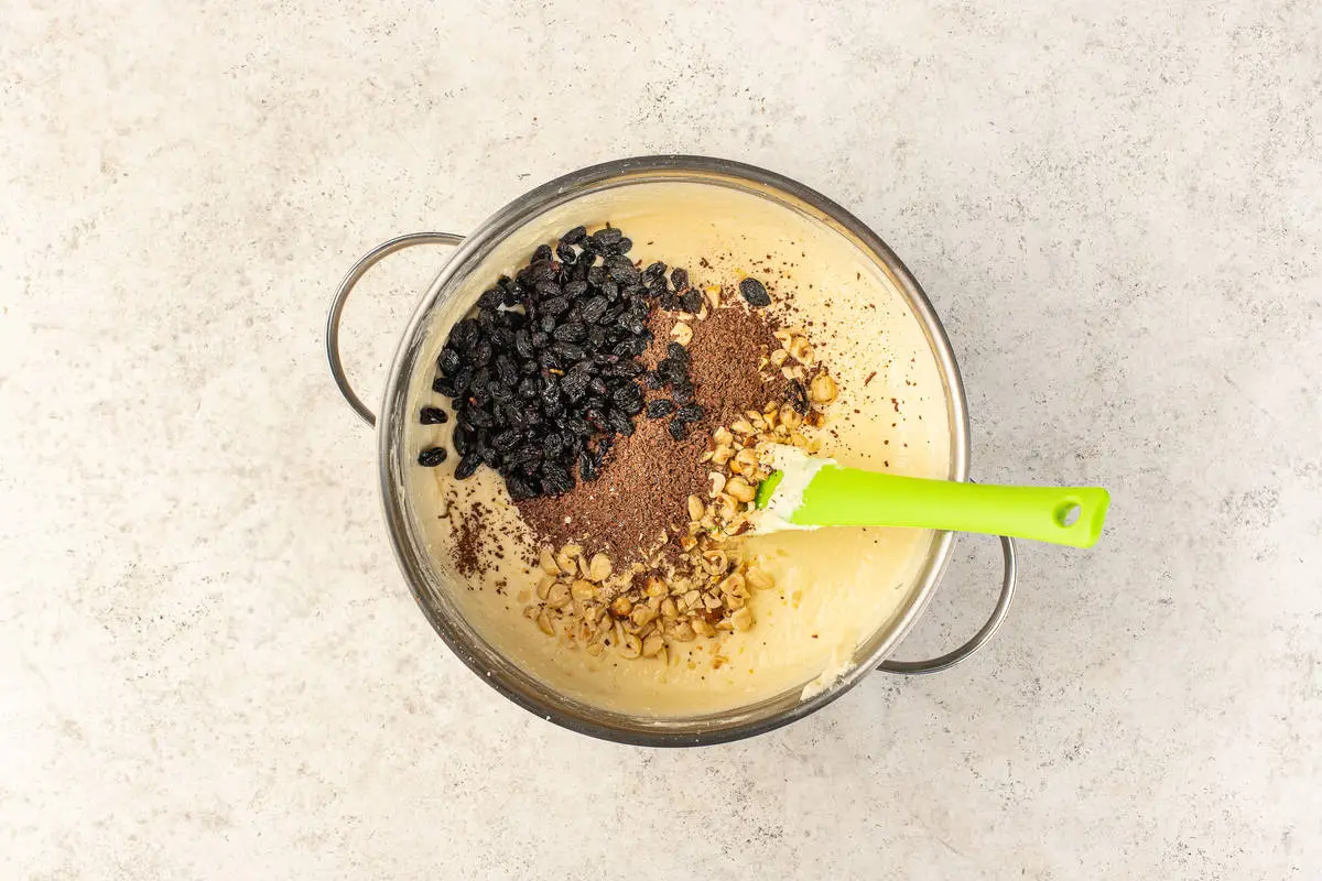 В остывшую массу добавьте орехи, изюм, шоколадную стружку и тщательно всё перемешайте.