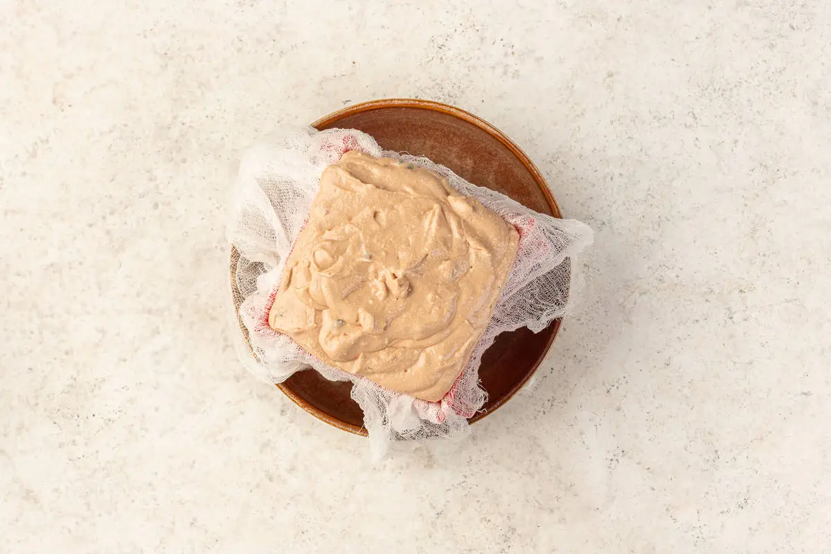 Переложите массу в пасочницу, укутанную марлей, слегка утрамбуйте и поставьте все в глубокую тарелку, чтобы было куда стекать жидкости. Уберите в холодильник на ночь.