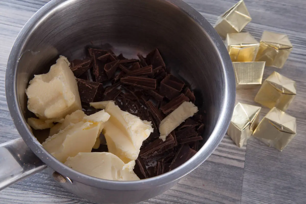 Шоколад и сливочное масло порезать и растопить на медленном огне, помешивая.