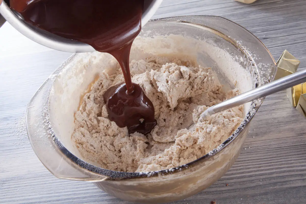 Яйца взбить с сахаром до светлой воздушной массы, смешать с шоколадом и маслом, добавить муку, соль и корицу, аккуратно перемешать.