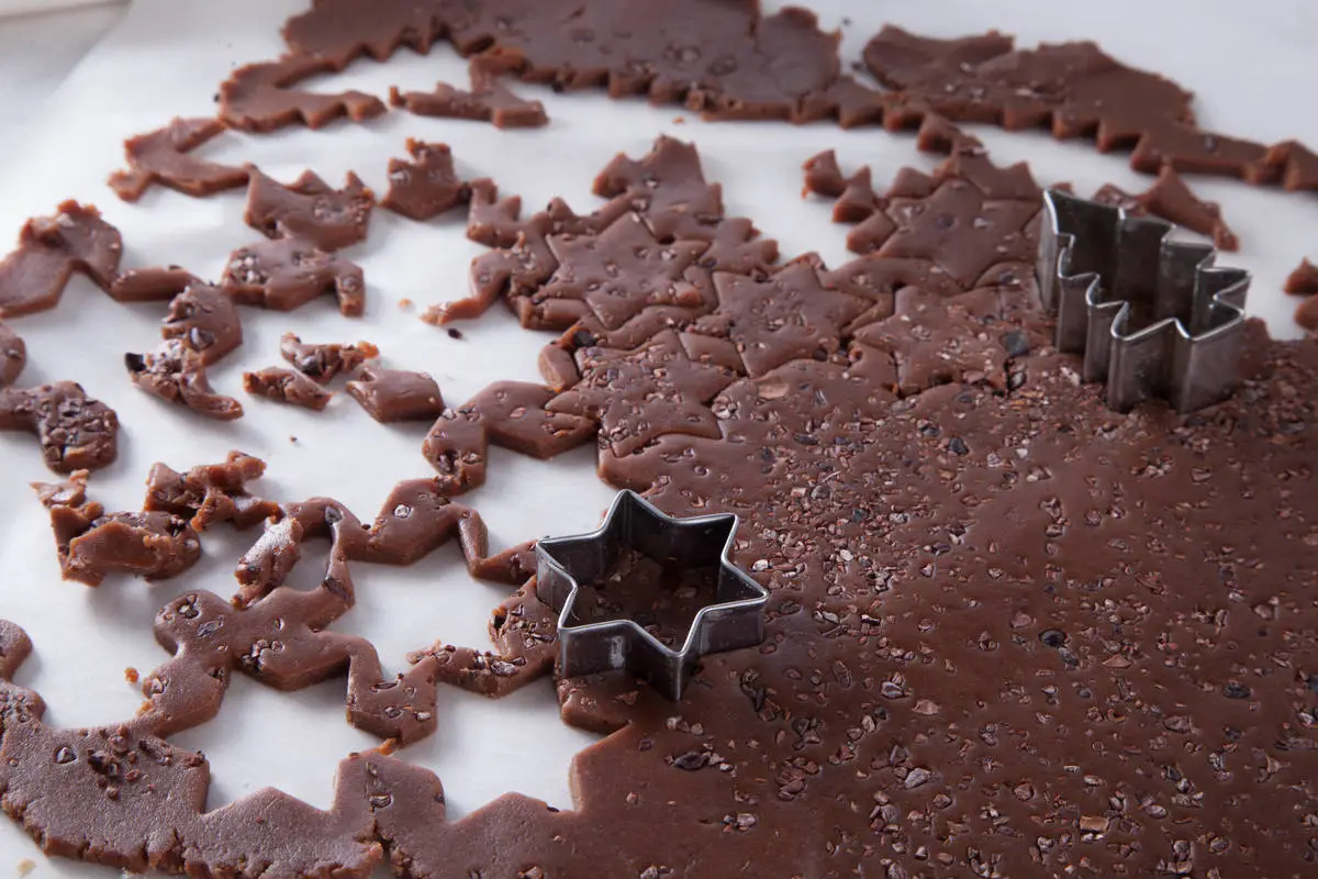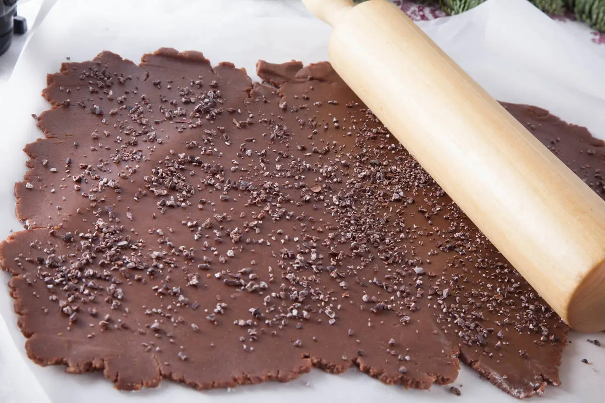 Охлажденное тесто раскатать скалкой, посыпать равномерно какао-крупкой и еще раз прокатать скалкой, вдавливая крупку в тесто.