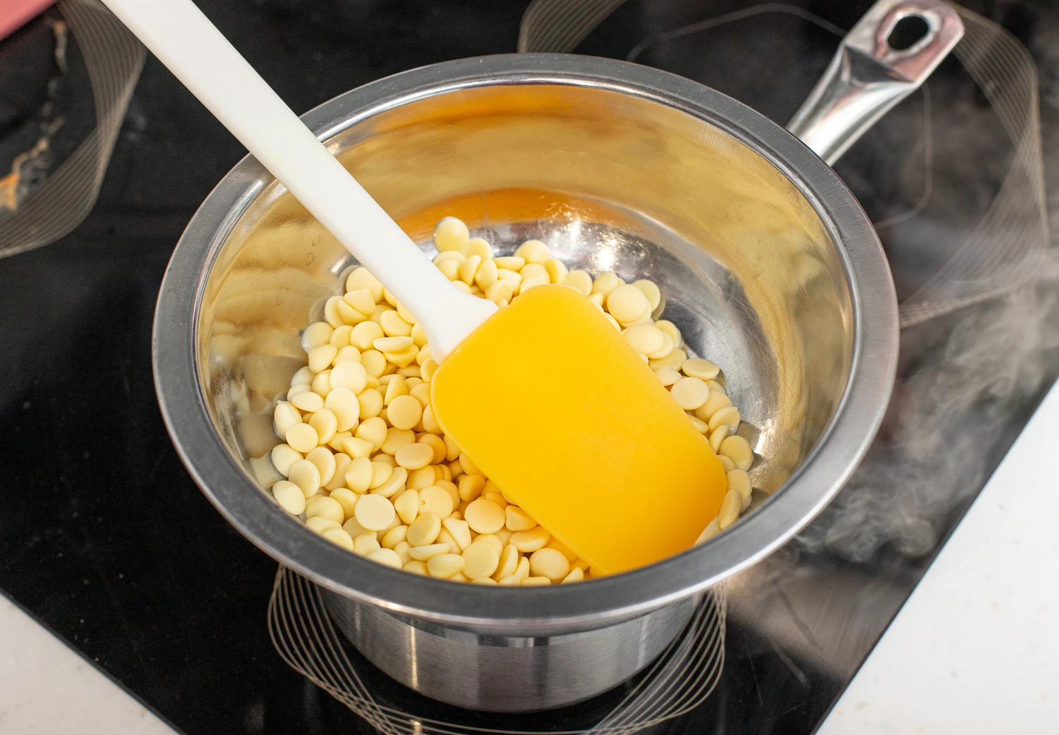 70 г шоколада растопите на водяной бане или короткими импульсами по 10–15 секунд в микроволновке. На этом этапе важно не перегреть массу. Добавьте оставшиеся 30 г шоколада и активно перемешайте массу силиконовой лопаткой, пока он не растает. Измерьте его температуру с помощью игольчатого или лазерного термометра: должно быть 29–30 °C.