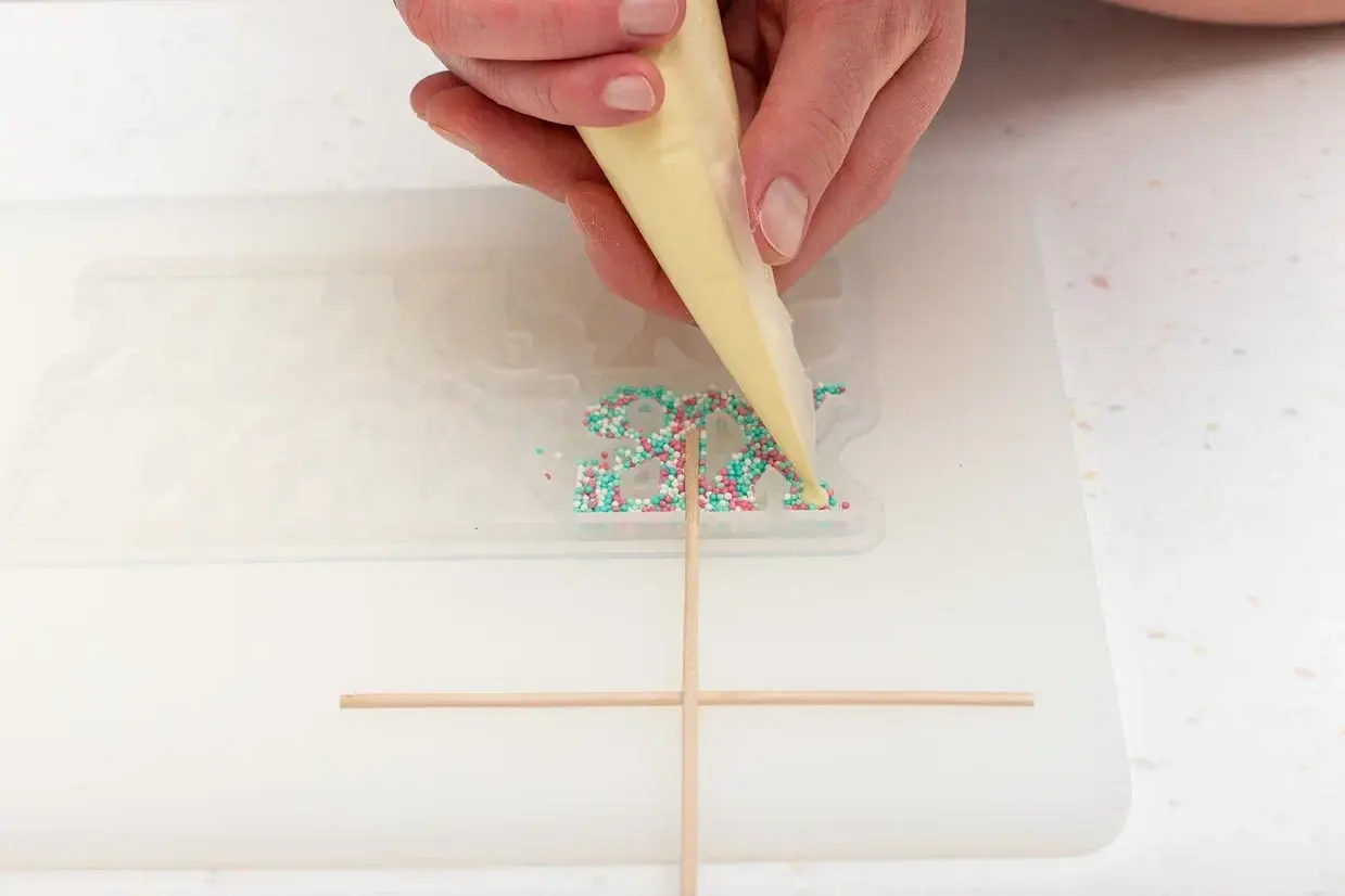 Залейте шоколад в подготовленную форму. Чтобы заполнить все её изгибы и не испачкать поверхность вокруг, воспользуйтесь кондитерским мешком.