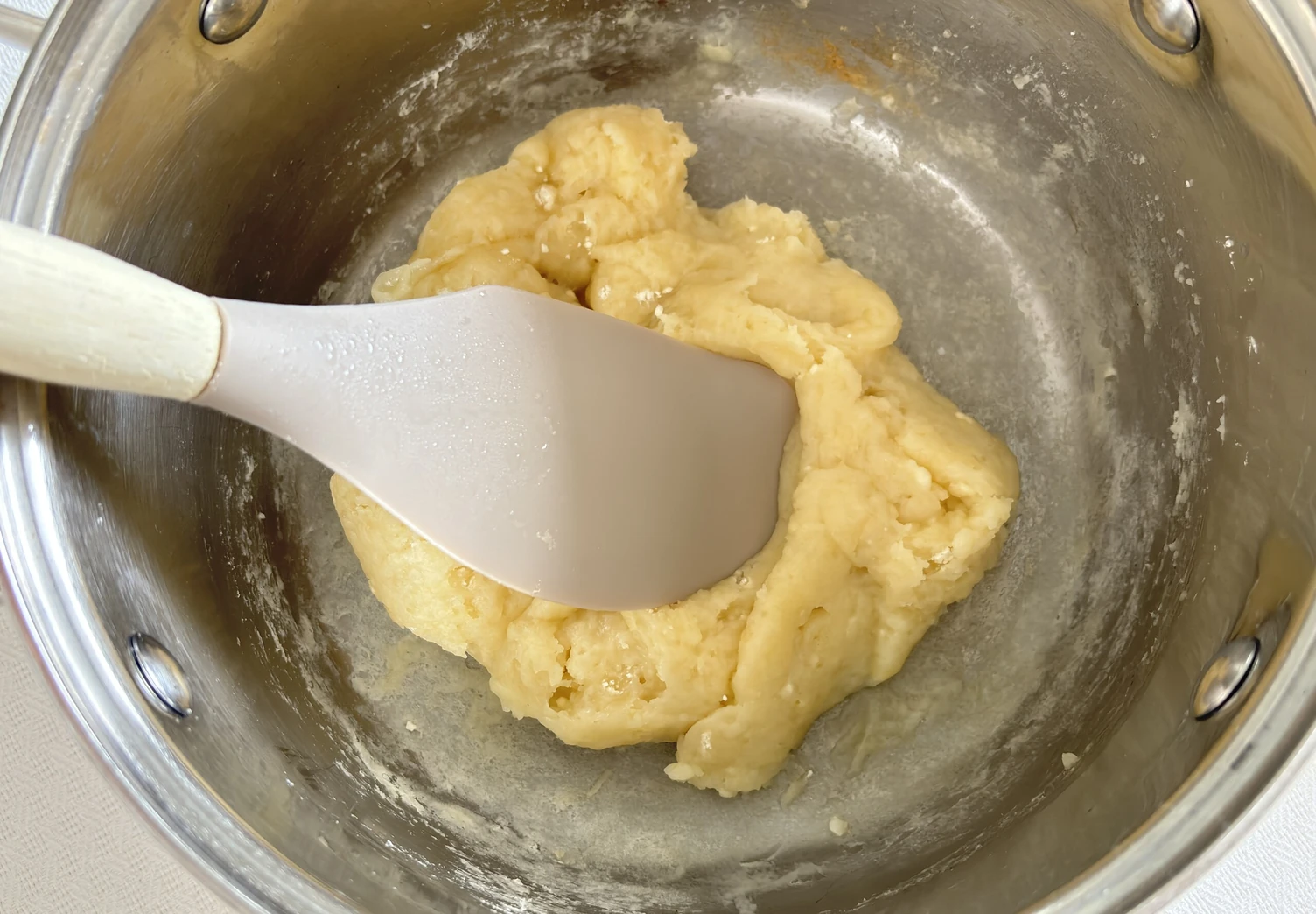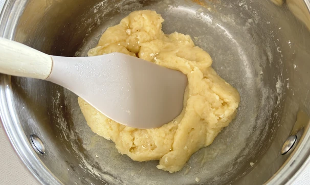 Когда масса начнёт кипеть, всыпьте муку и перемешайте. Заваривайте тесто до того момента, пока на дне сотейника не начнёт образовываться плёнка.
