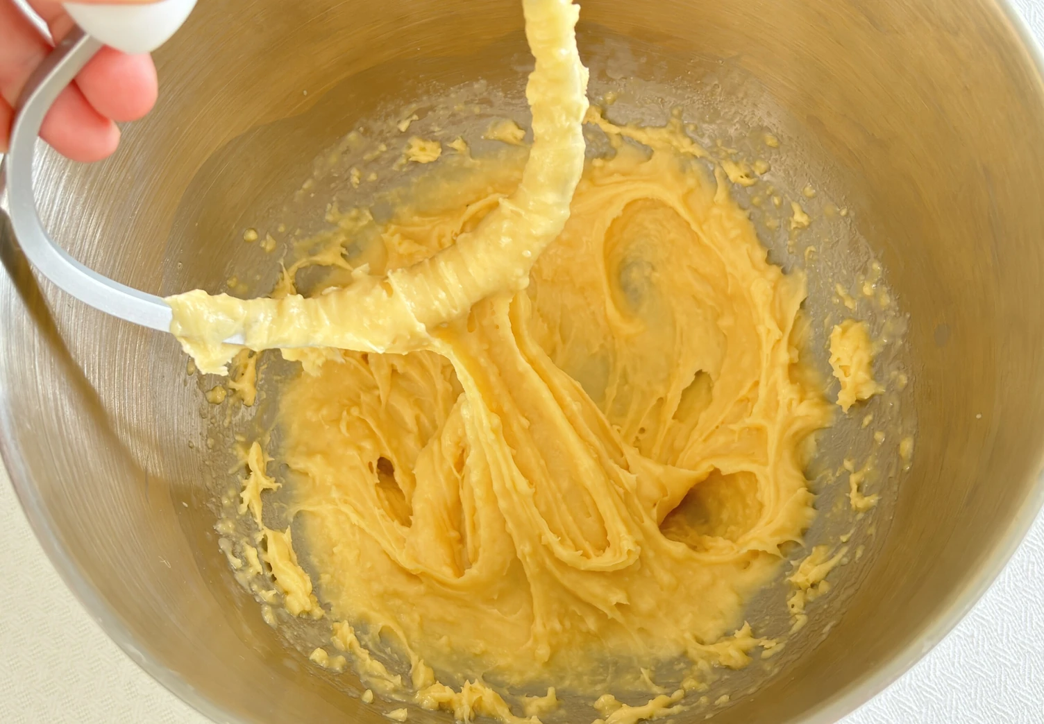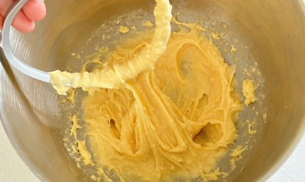 Переложите тесто в чашу миксера и влейте в него половину яиц. Начните замешивать с помощью насадки-лопатки, постепенно добавляя оставшуюся яичную массу. Готовое тесто должно получиться консистенции зубной пасты.