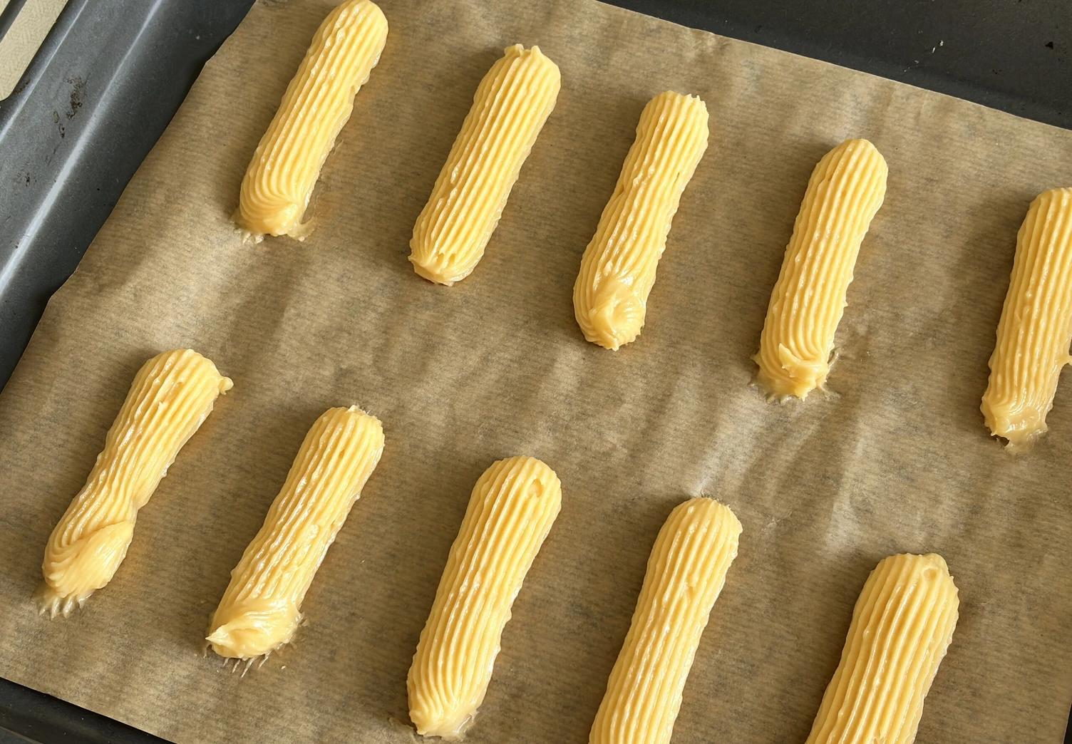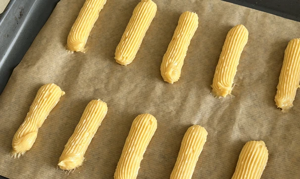 Переложите тесто в кондитерский мешок с насадкой «открытая звезда». Выдавите на застеленный пергаментом противень полоски и отправьте в духовку, разогретую до 220°C, на 20 минут.