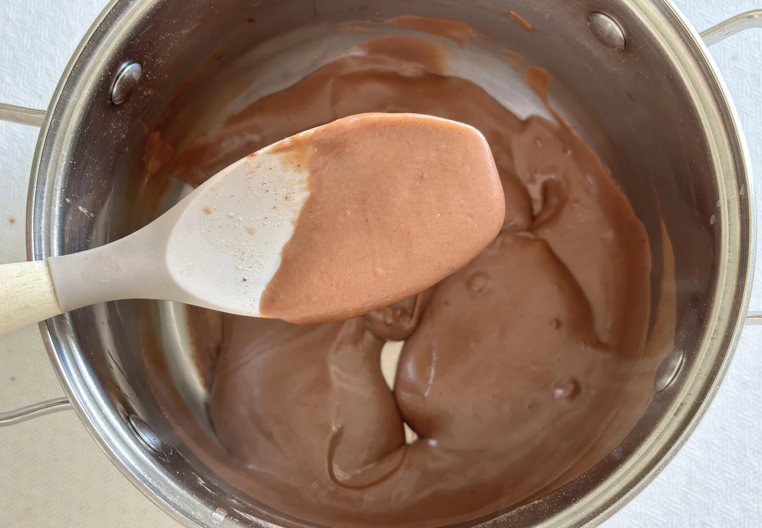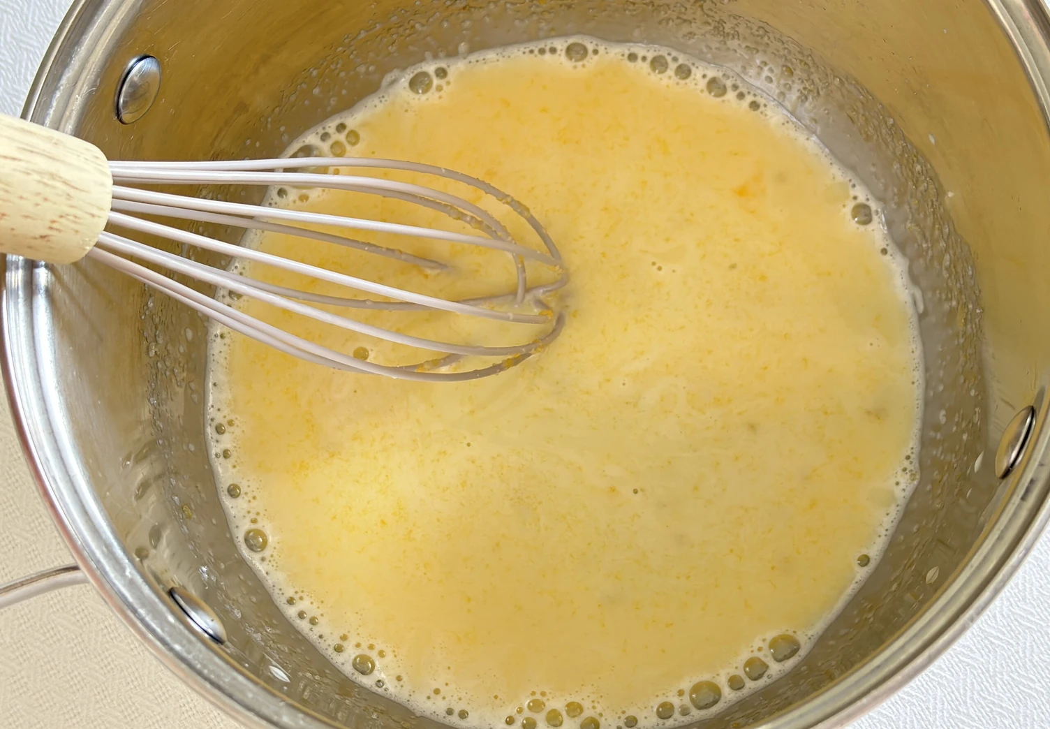 Когда крем начнёт густеть, влейте оставшееся молоко и продолжайте уваривать крем, постоянно помешивая.