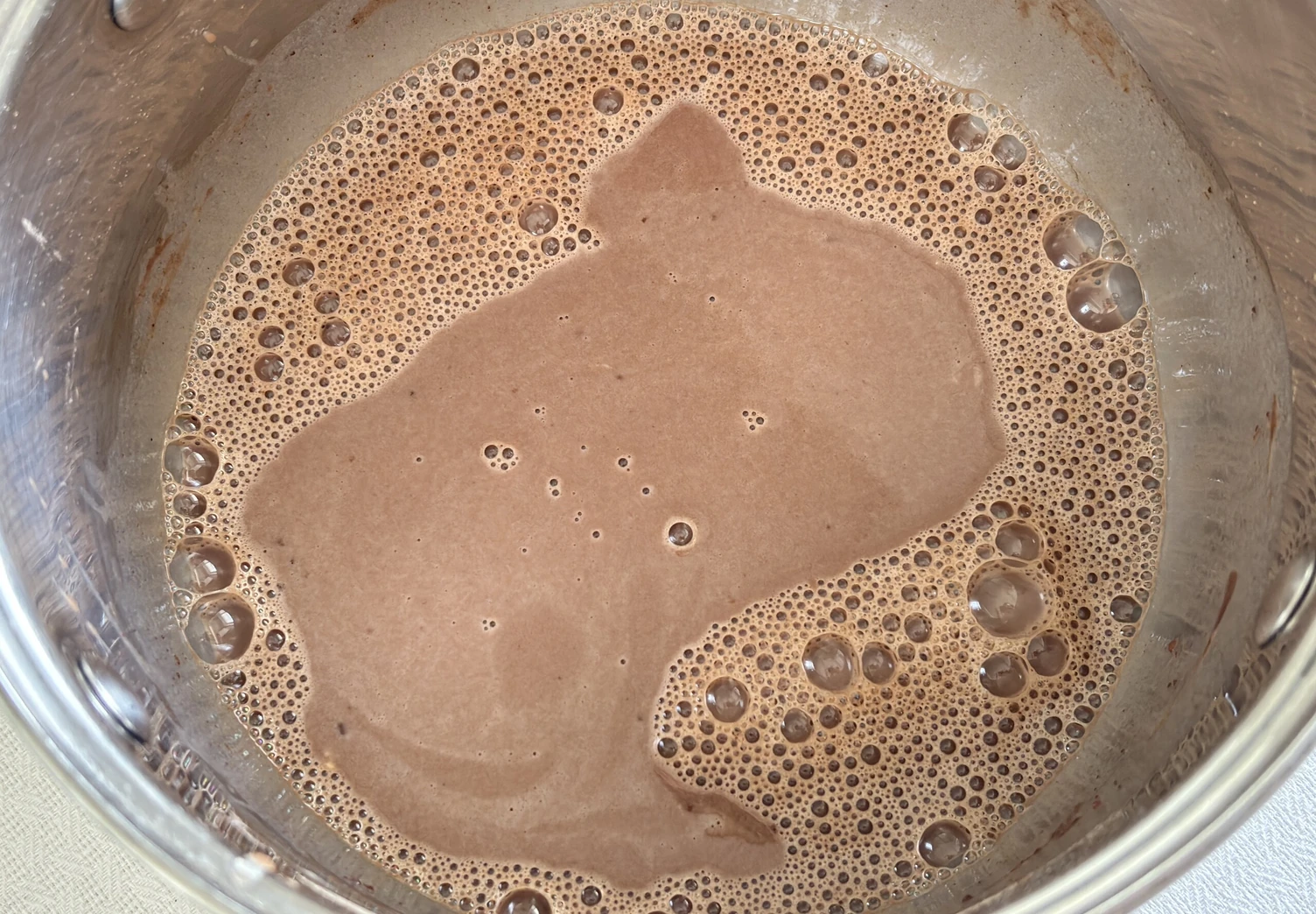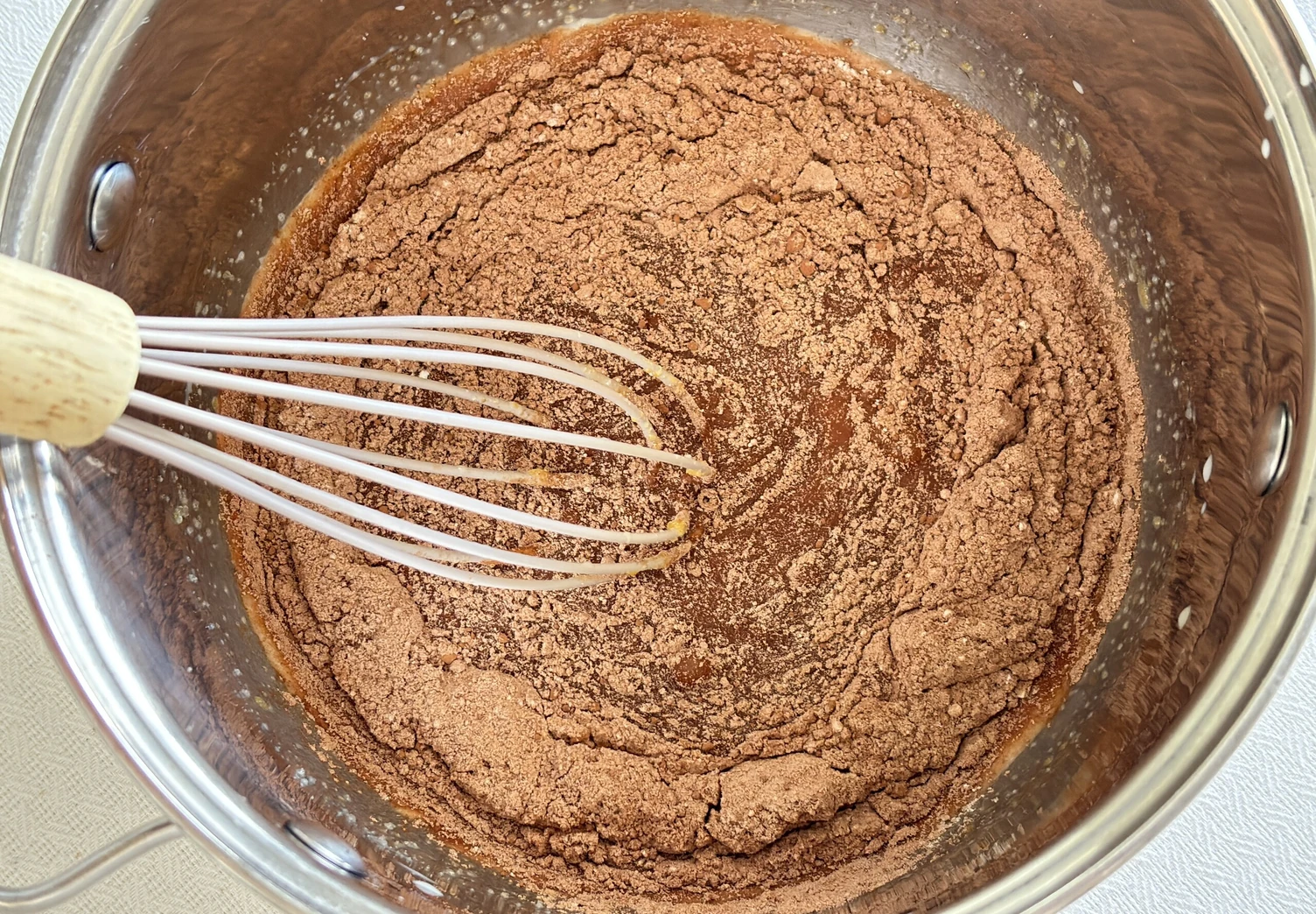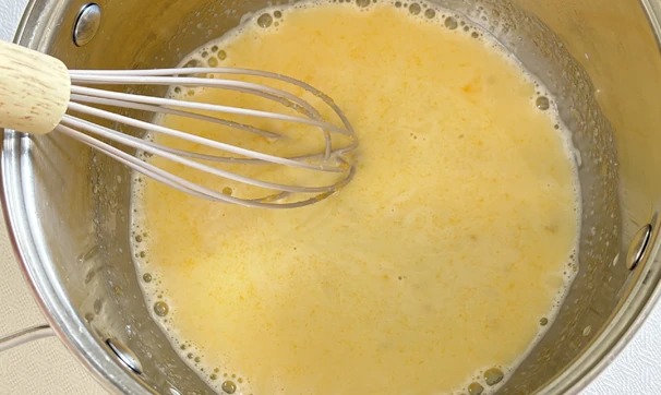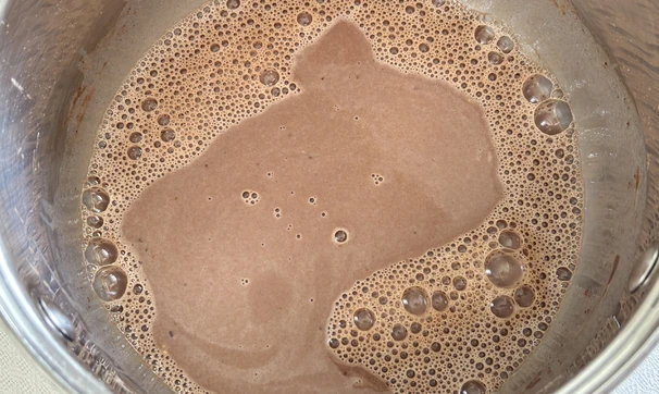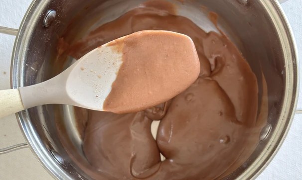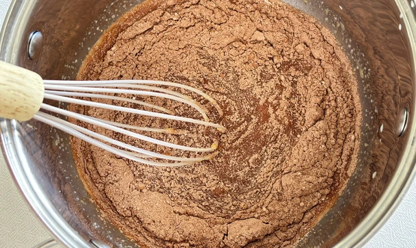 Всыпьте в молочную смесь какао и муку, снова тщательно перемешайте. Поставьте крем на средний огонь и постоянно мешайте венчиком.