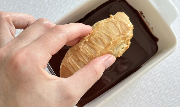 Растопите шоколад на водяной бане или короткими импульсами в микроволновке и глазируйте им эклеры. Охладите, чтобы шоколад застыл.
