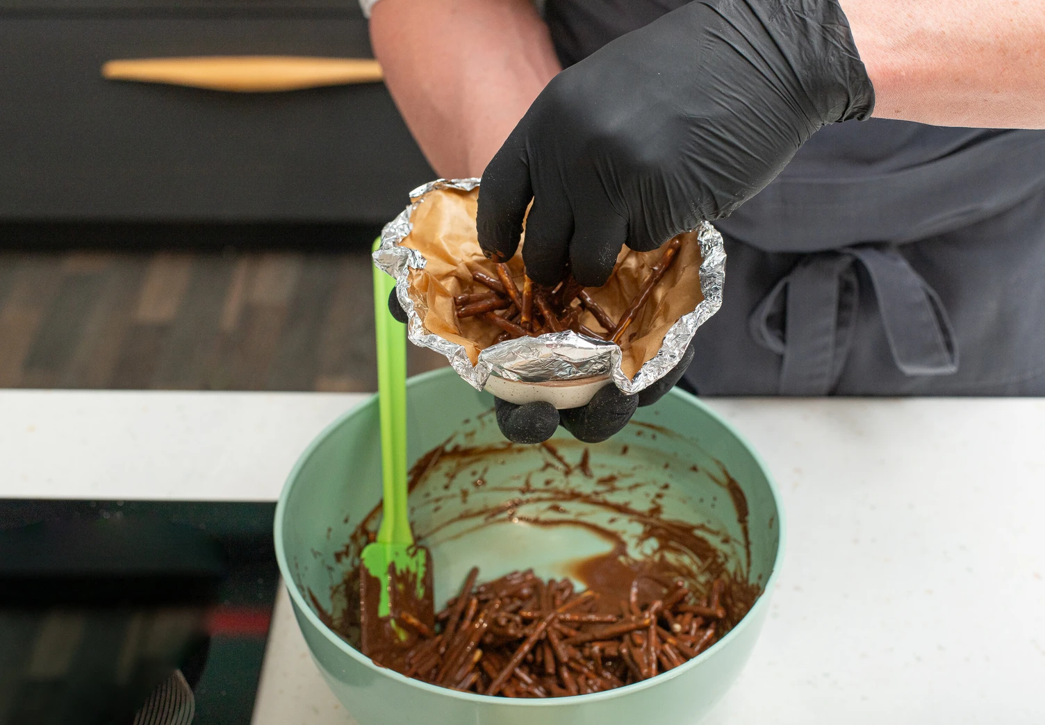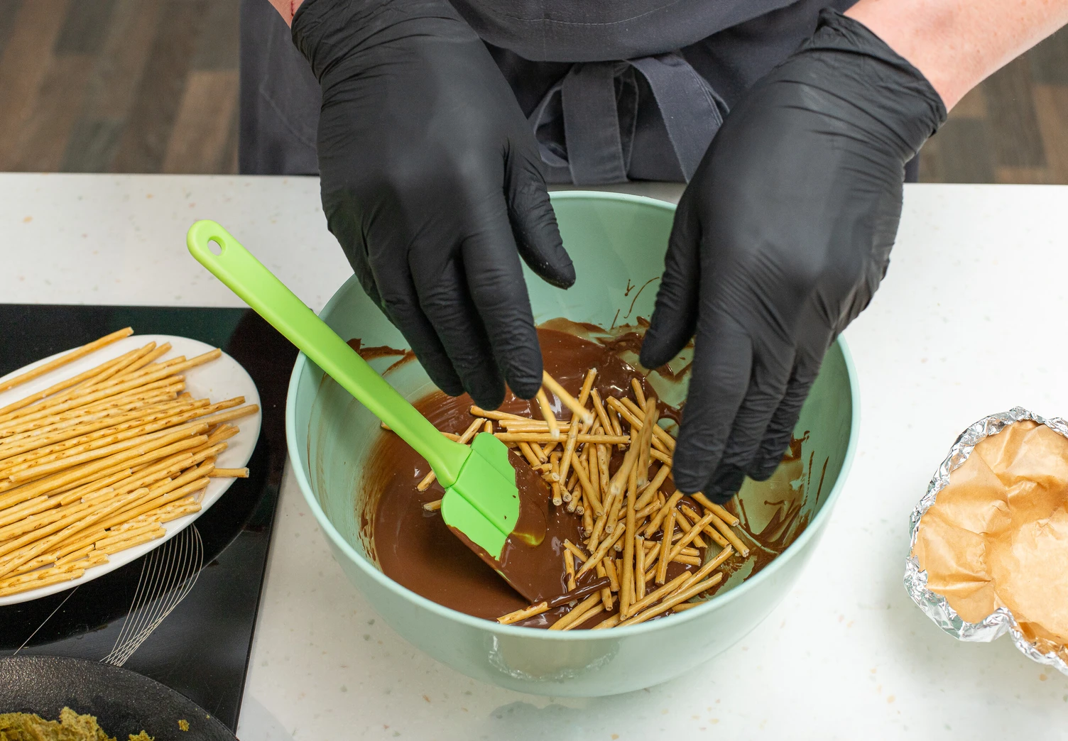 Смешайте с помощью лопатки шоколад с соломкой так, чтобы он равномерно распределился по всей поверхности палочек.