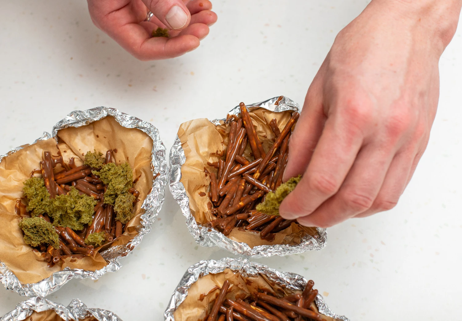 Украсьте готовое гнезда кусочками мха и шоколадным драже по желанию.