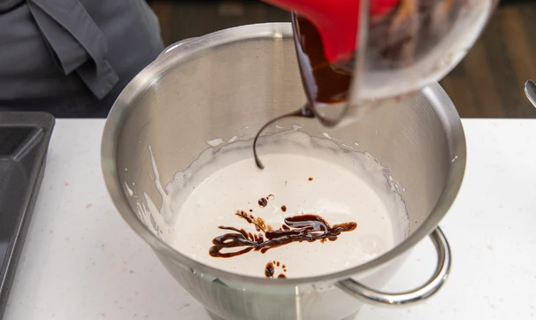 Аккуратно подмешайте шоколадную массу к взбитым яйцам. Влейте молоко.