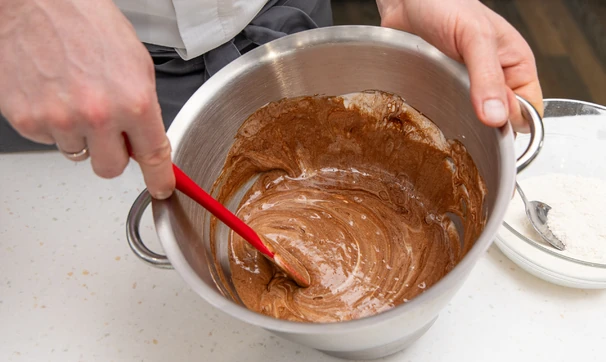 Смешайте все оставшиеся сухие ингредиенты и добавьте в тесто. Перемешайте до гладкой, однородной массы.