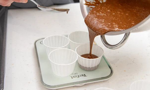 Выложите тесто (по 55 г) в формочки и поставьте в духовку, разогретую до 190 °C, на 19 минут.