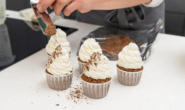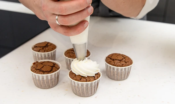Переложите крем в кондитерский мешок с насадкой «звезда» и сделайте шапочки на капкейках.