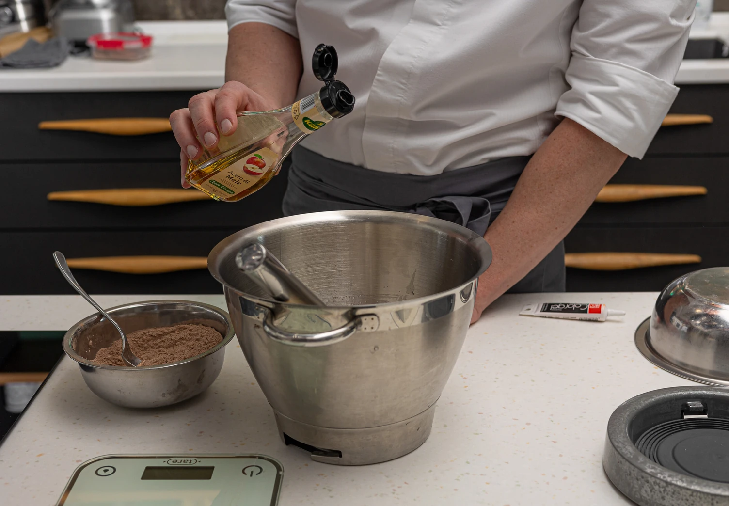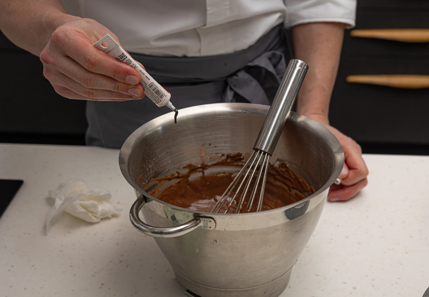 Добавьте сыпучие ингредиенты к жидким и размешайте до однородности. Если хотите сделать тесто тёмным, добавьте немного бордового и чёрного красителей.