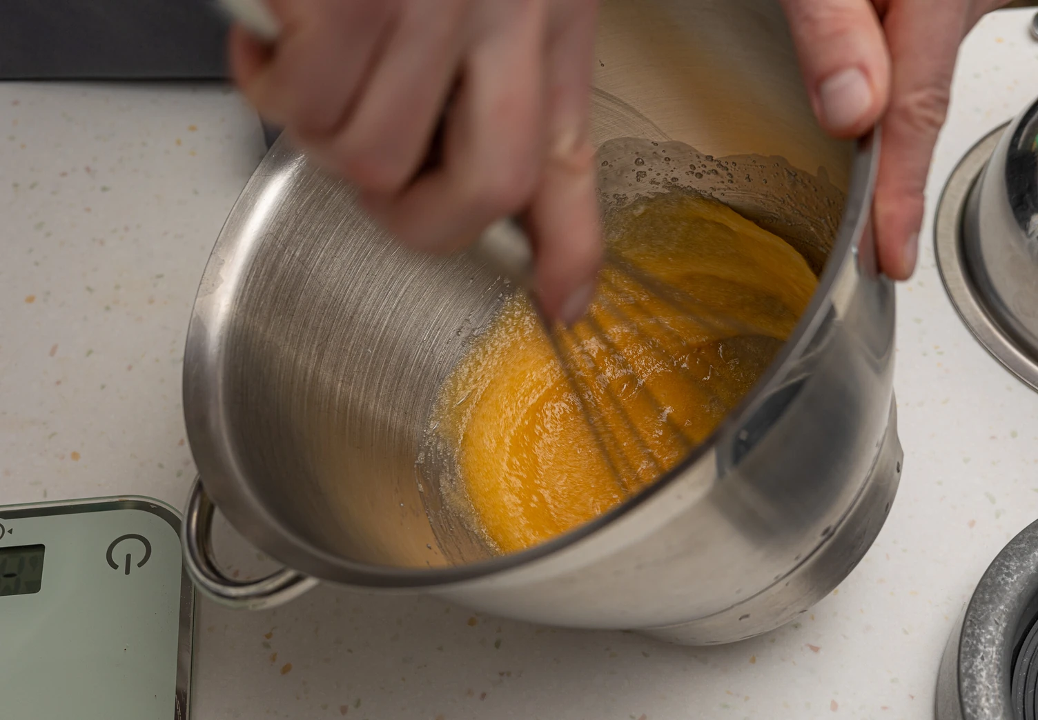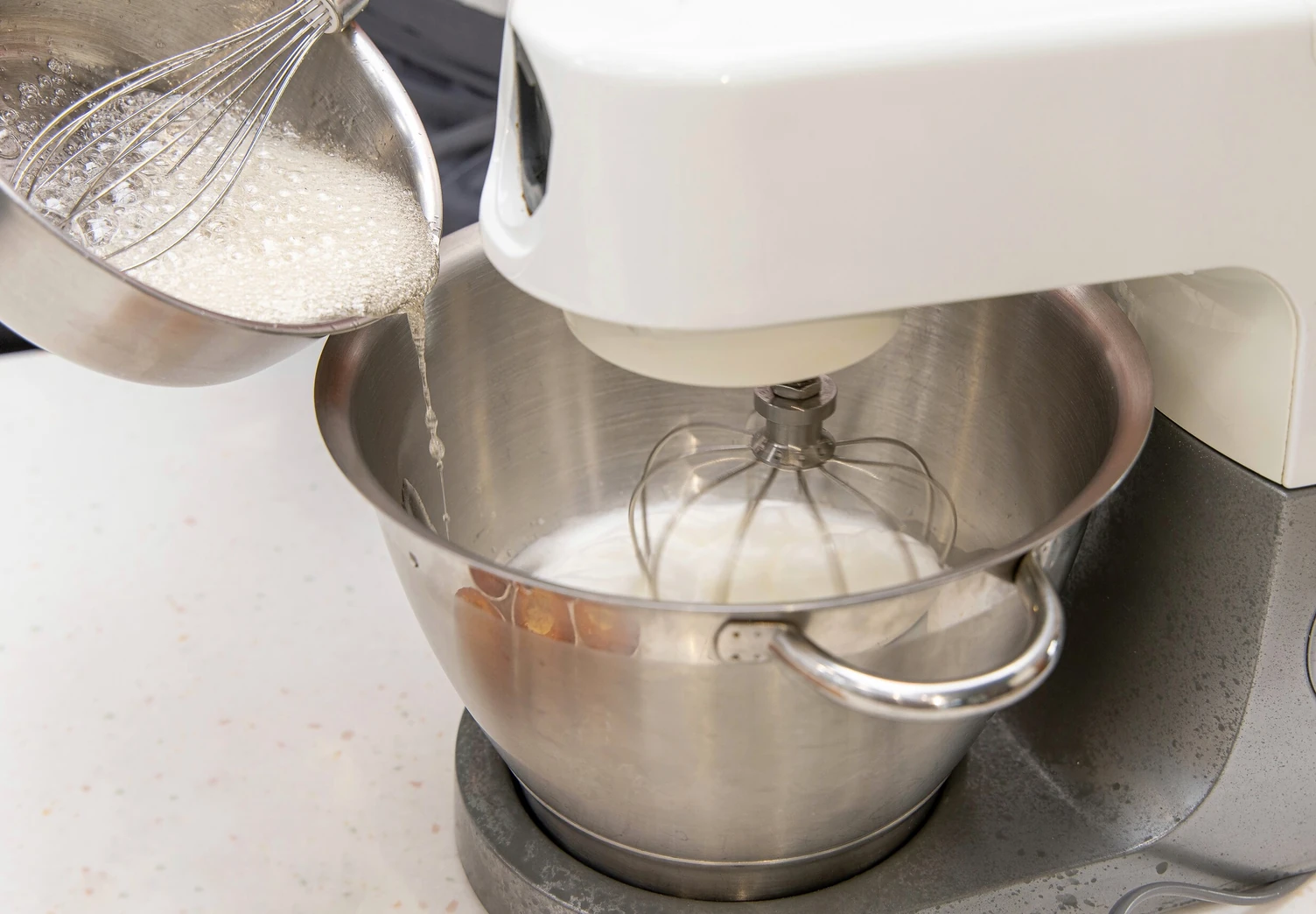 Доведите содержимое сотейника до кипения и начните взбивать белки на средней скорости. Как только температура сиропа достигнет 118 °C, влейте его тоненькой струйкой по стенке чаши миксера в белки. Продолжайте взбивать меренгу до устойчивых пиков ещё около 10 минут.