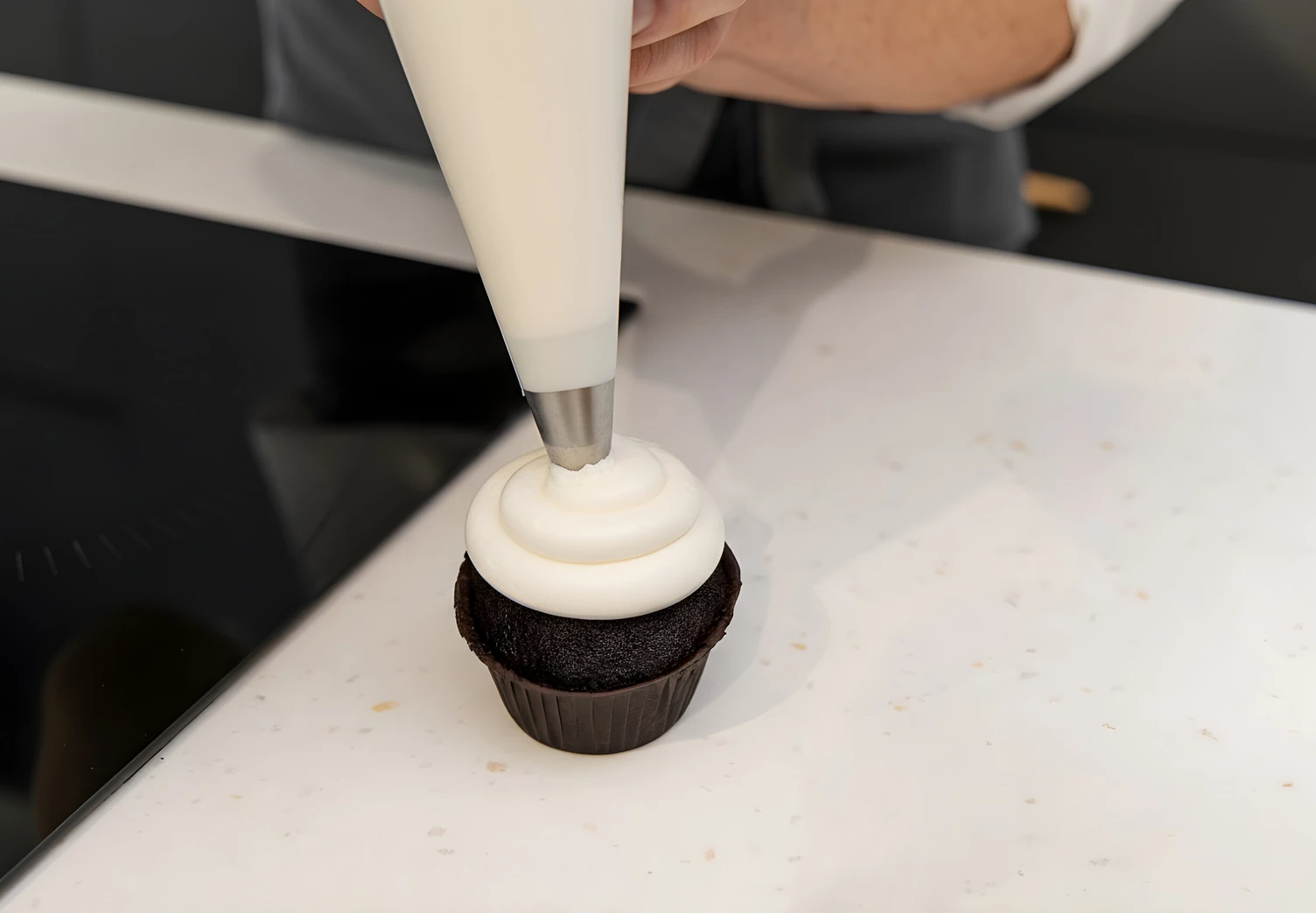 Переложите готовую меренгу в кондитерский мешок и отсадите пышные шапочки на капкейки. Украсьте съедобными «глазками».