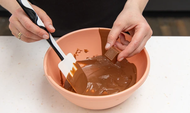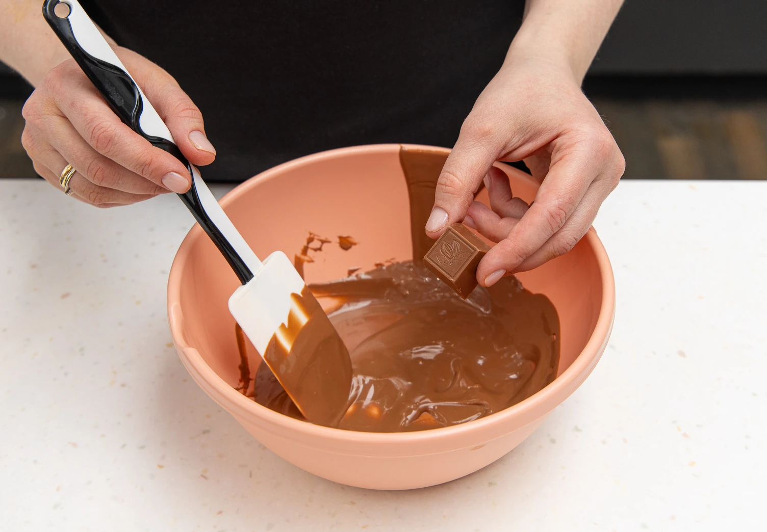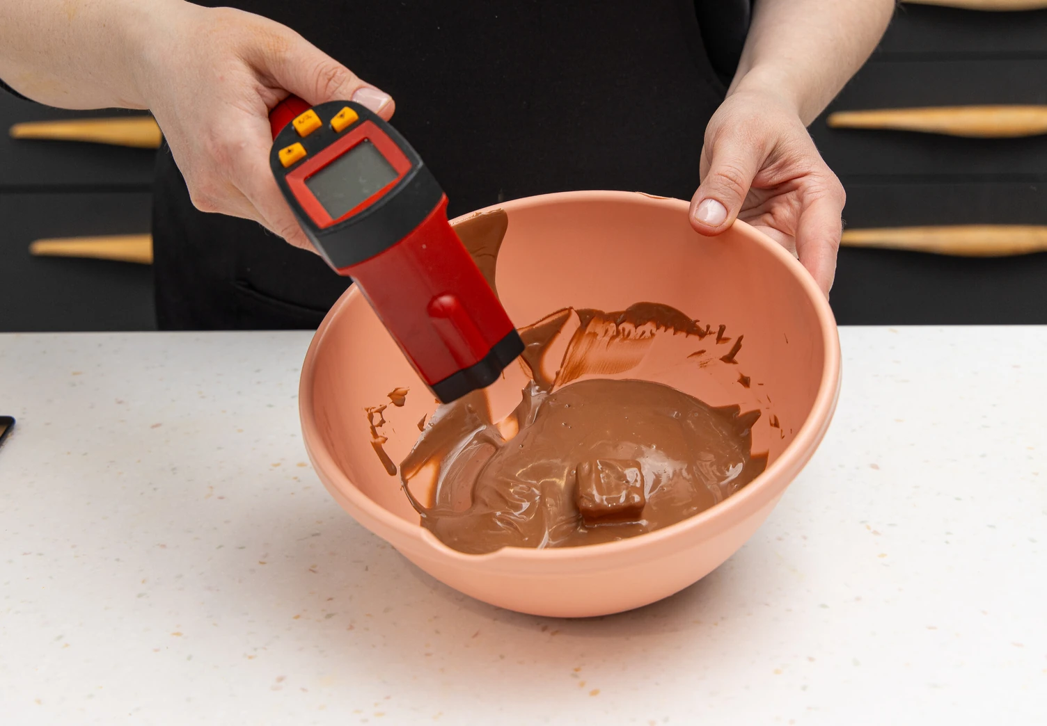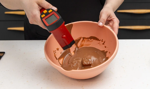 Добавьте оставшиеся 40 г шоколада и активно перемешивайте силиконовой лопаткой, пока он не растает. Измерьте температуру получившейся массы с помощью игольчатого или лазерного термометра: она должна быть 29–30 °C.