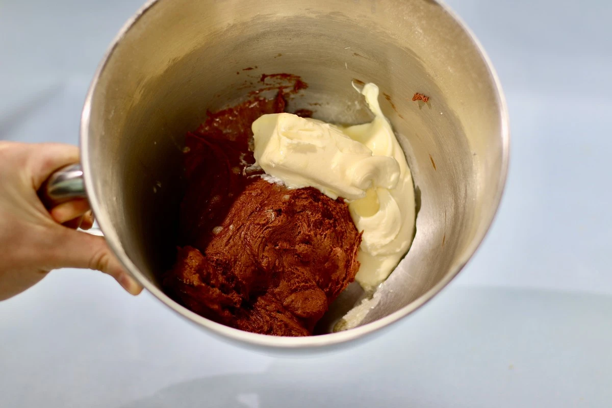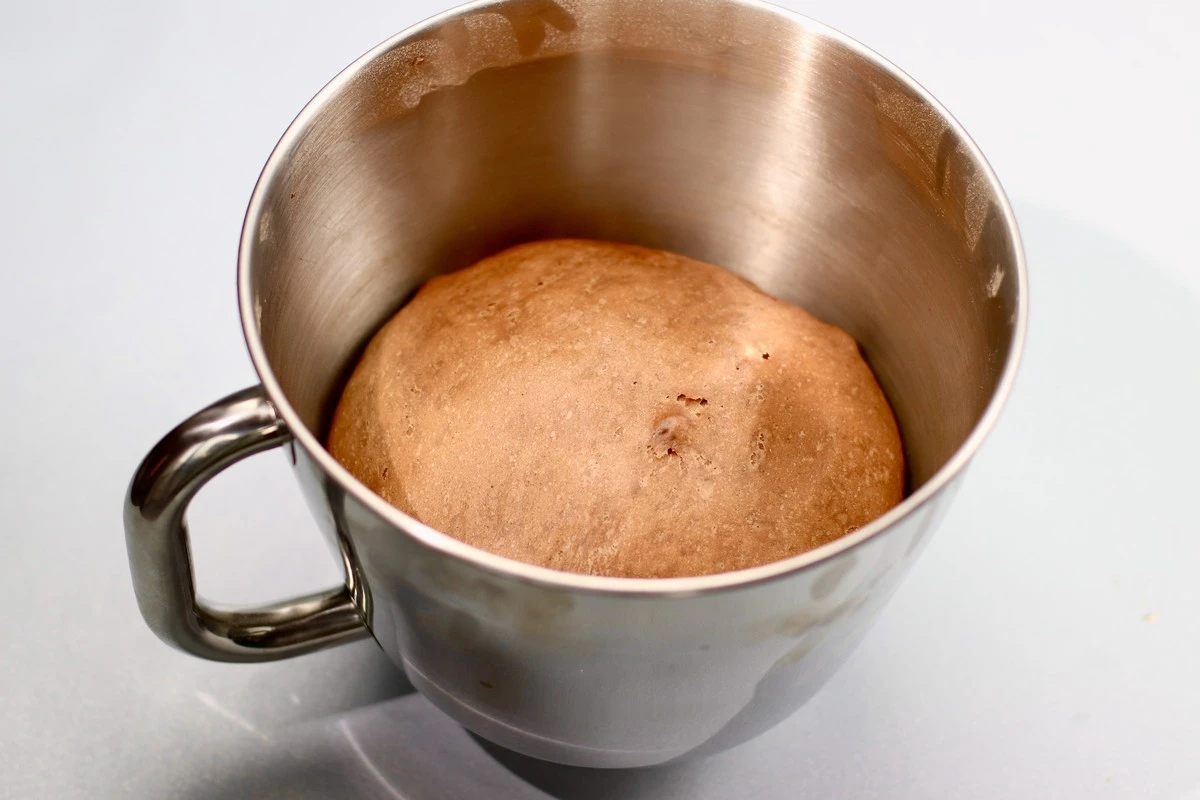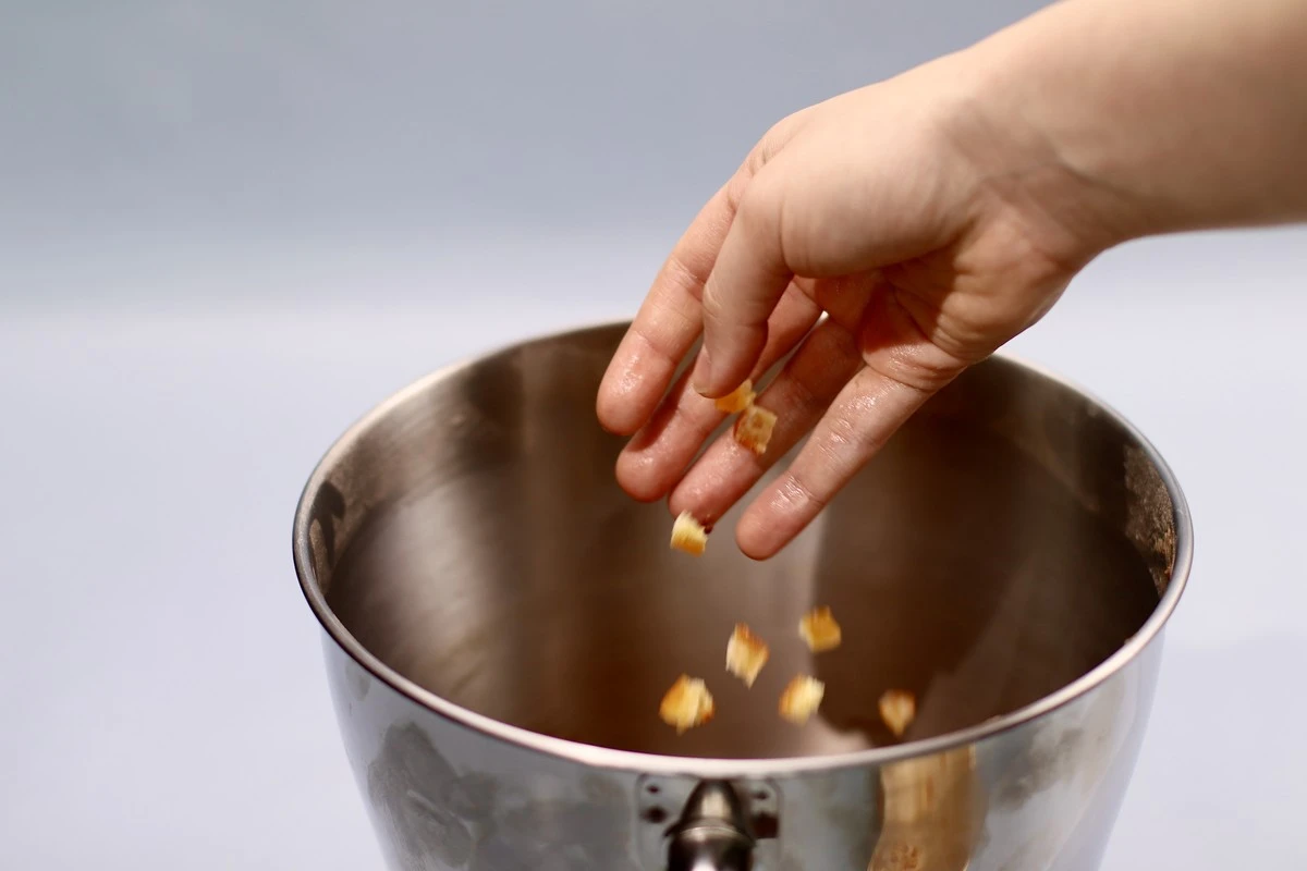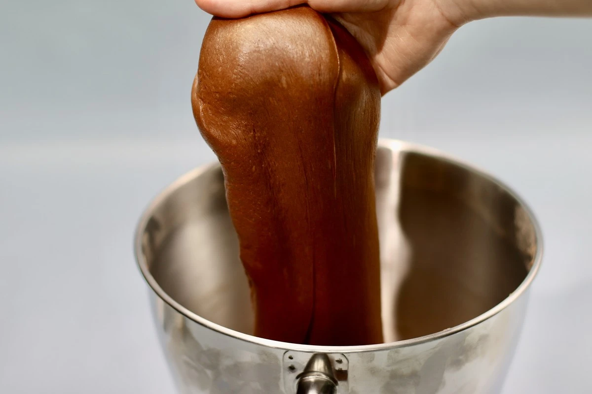 Когда тесто станет однородным, введите размягчённое сливочное масло комнатной температуры. Вымешивайте ещё около 15 минут до эластичности и мягкости.