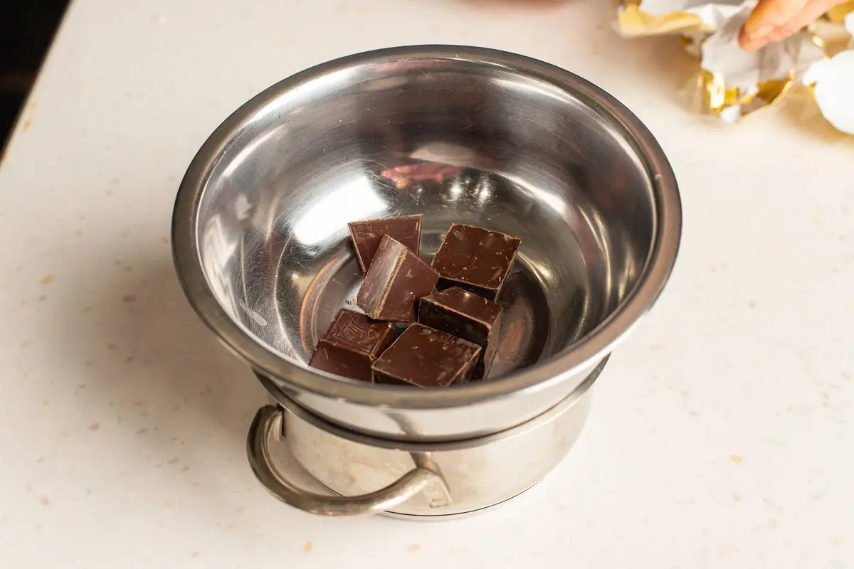 Шоколад растопите на водяной бане, постоянно помешивая, снимите с огня и дайте остыть примерно до 45 °C.