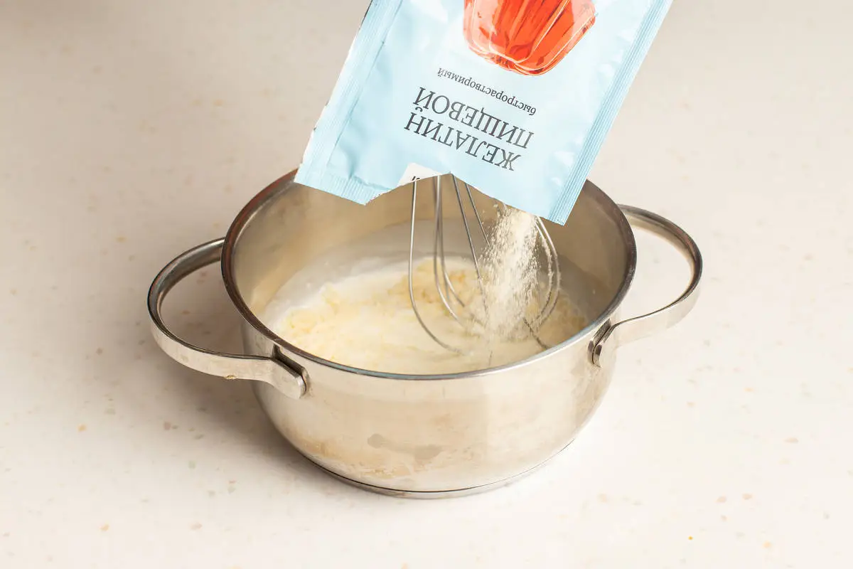 Небольшое количество сливок подогрейте и соедините с желатином, размешайте до растворения.