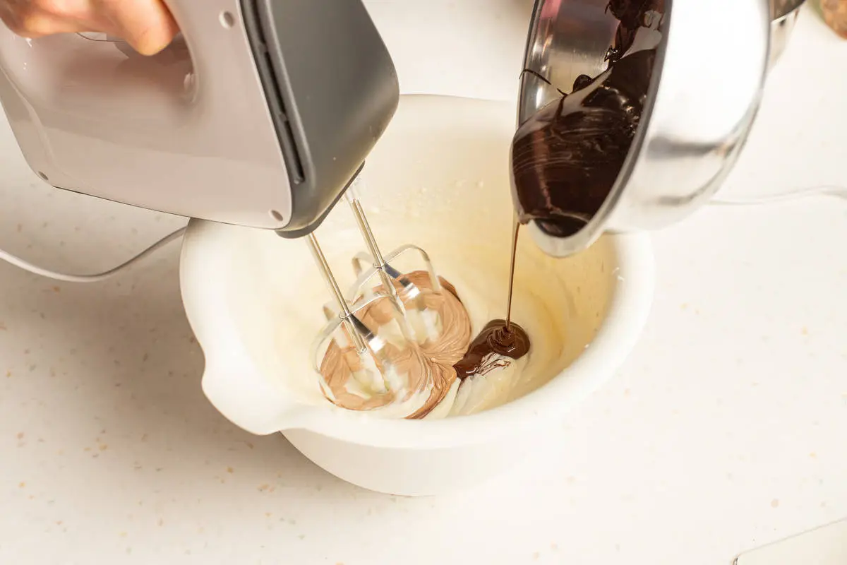 Оставшиеся сливки взбейте до мягких пиков миксером, добавьте к ним сливки с растворенным желатином и шоколад, взбейте всё вместе.