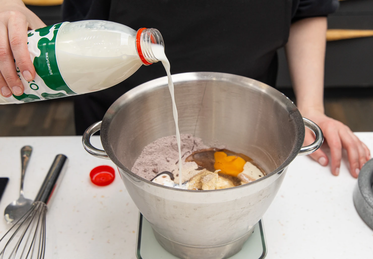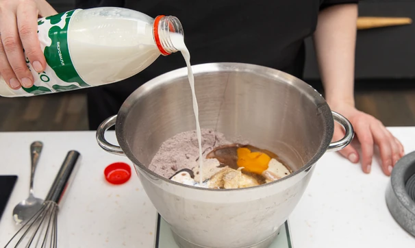 Добавьте два яйца, мягкое сливочное масло, растительное масло, молоко и в самом конце уксус. Перемешайте массу миксером до гладкой однородной консистенции.