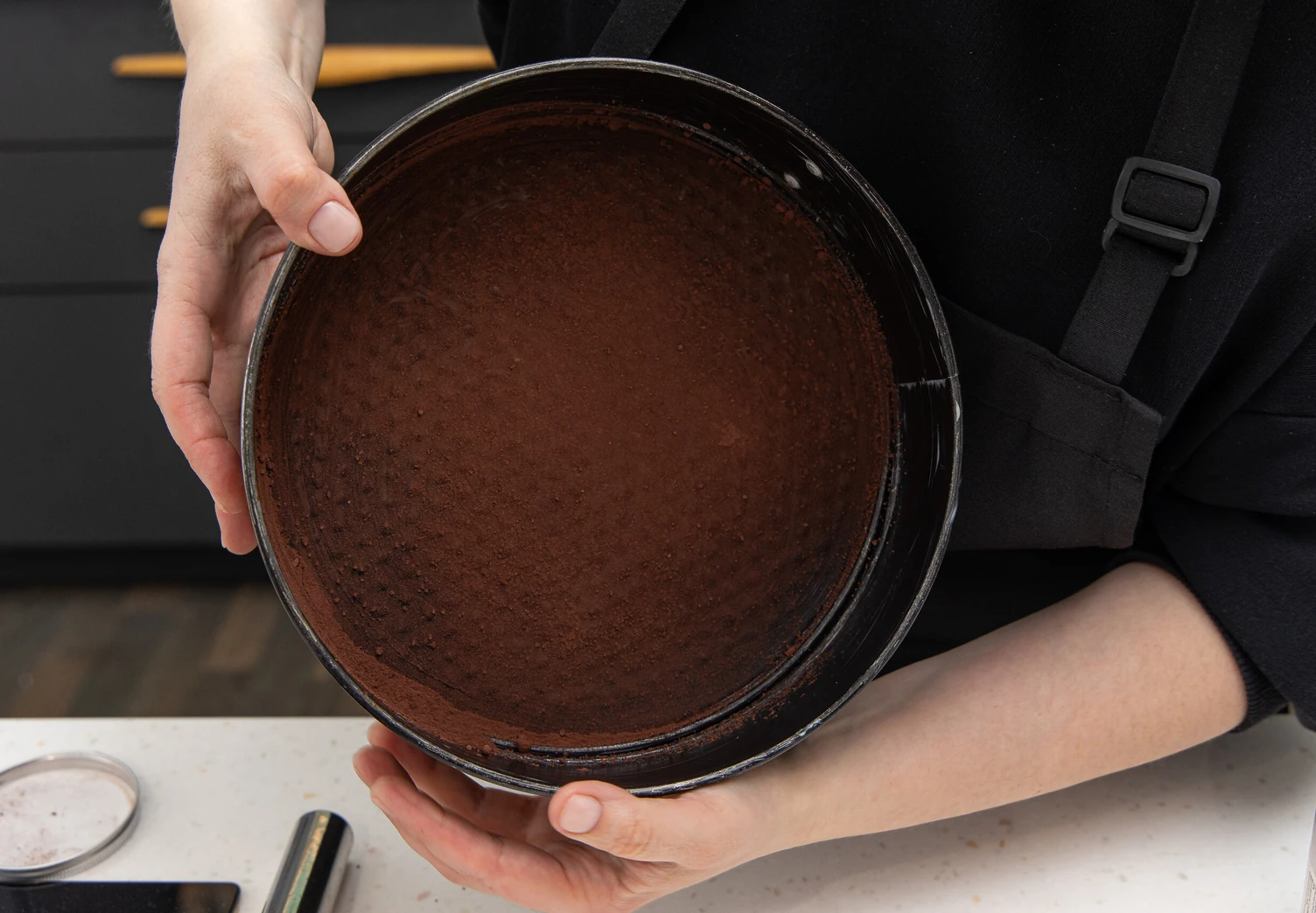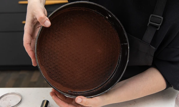 Разъёмную форму диаметром 23 см смажьте маслом и слегка присыпьте какао-порошком.