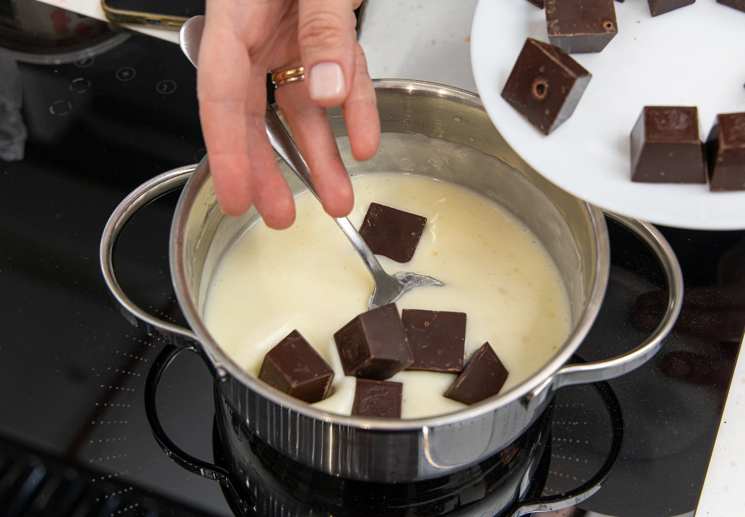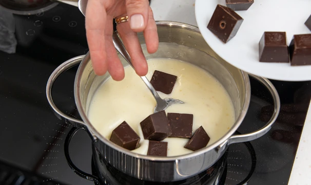 Добавьте тёмный шоколад, дайте постоять пару минут, затем перемешайте силиконовой лопаткой до состояния гомогенной массы. Добавьте мягкое сливочное масло, накройте пищевой плёнкой так, чтобы она соприкасалась с поверхностью крема, и уберите его в холодильник на пару часов.