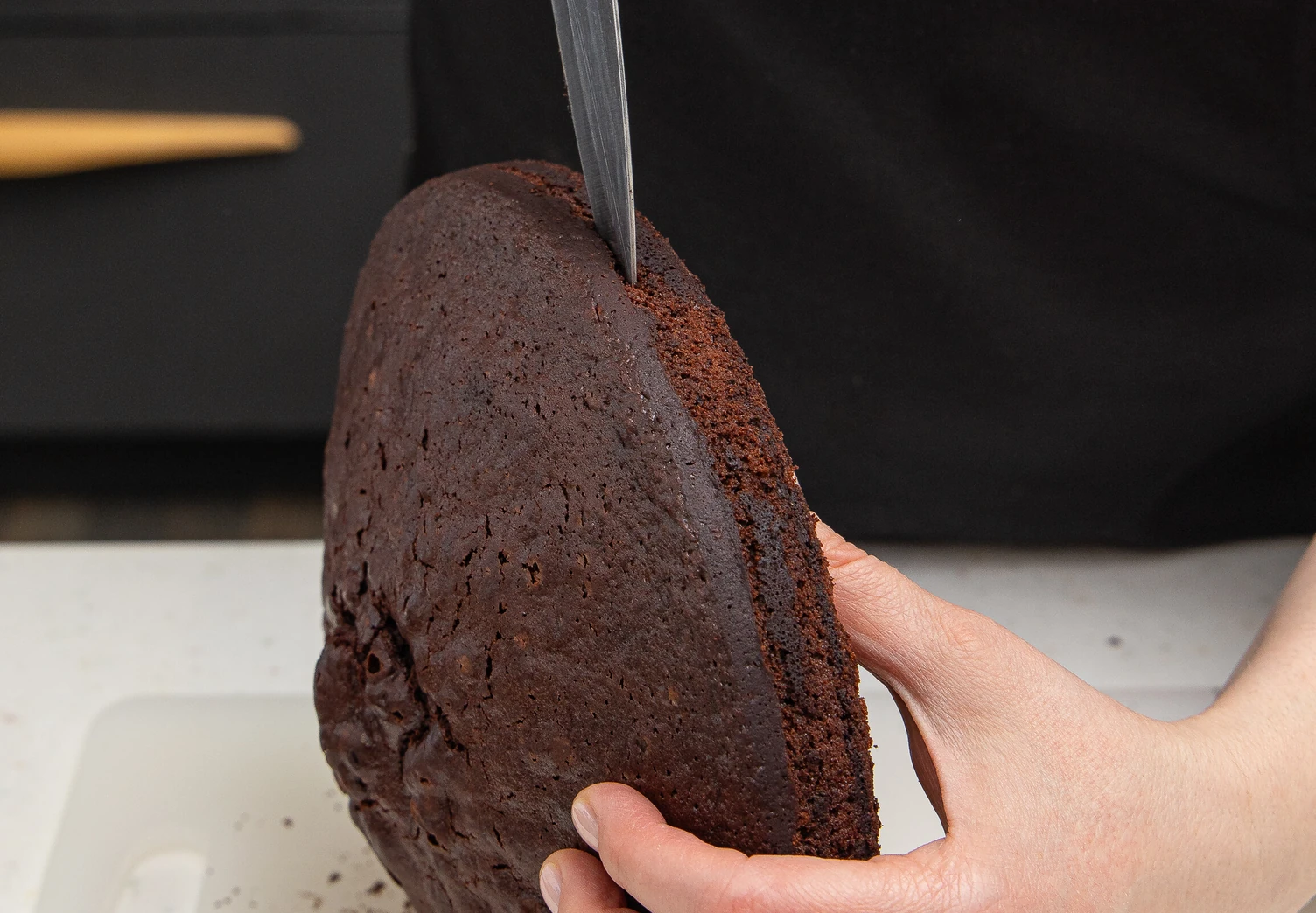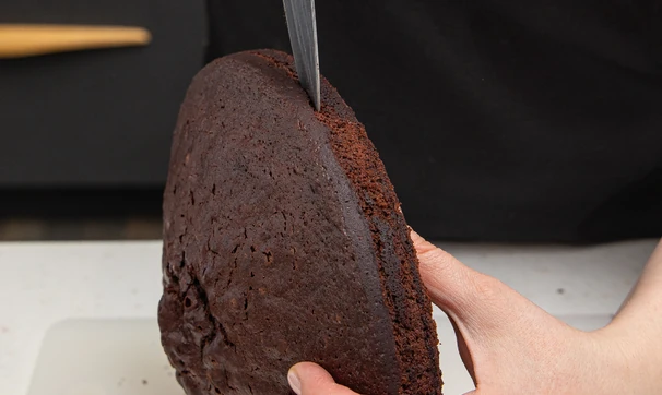 У охлаждённого коржа срежьте верхушку (остатки бисквита можно использовать для трайфлов с тыквой или пирожного «Картошка») и разрежьте его вдоль пополам.