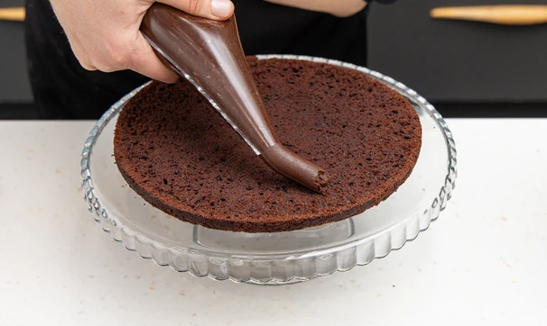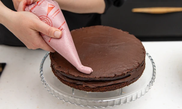 Смажьте коржи шоколадным кремом. Если он стал слишком «дубовым», дайте ему постоять при комнатной температуре полчаса.