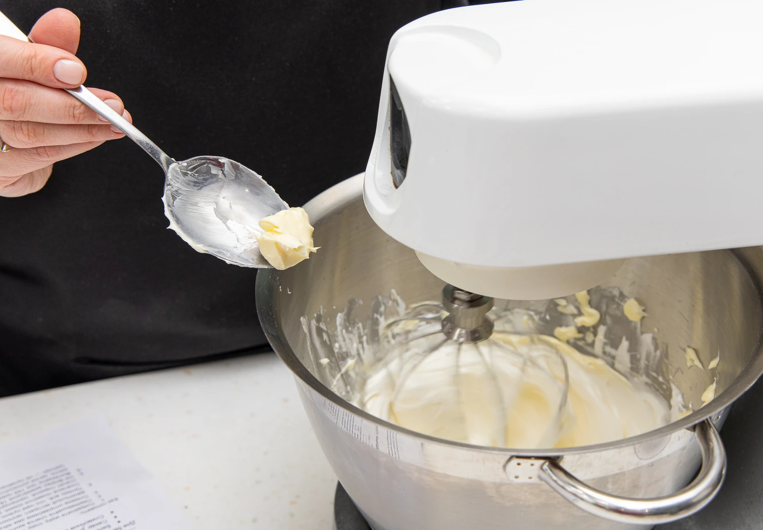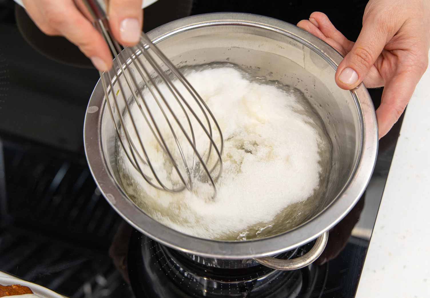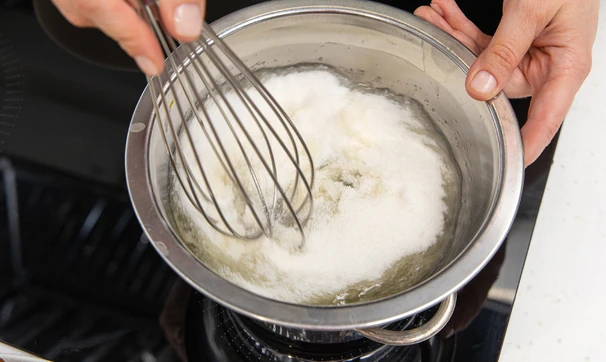 Для белково-масляного крема в белки добавьте сахар и поставьте на водяную баню. Важно: миска не должна касаться кипящей воды. Непрерывно перемешивайте массу венчиком до тех пор, пока все кристаллы сахара не растворятся. Обычно на это требуется около 7 минут, а температура белковой массы достигает 55–60 °C.