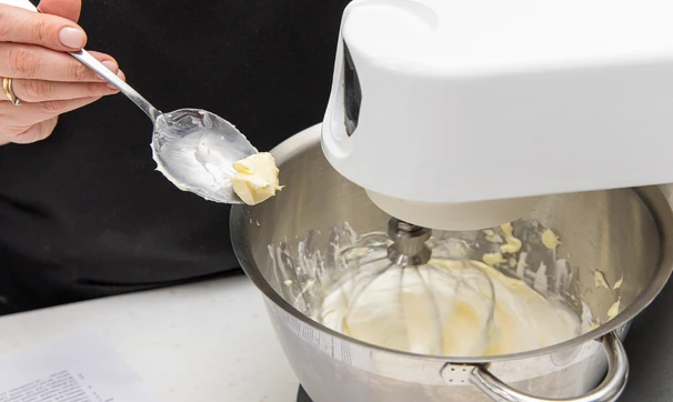 Затем снимите посуду с белками с огня и продолжайте взбивать миксером до тех пор, пока масса не остынет до комнатной температуры (2–3 минуты), затем начните добавлять небольшими порциями (не более столовой ложки) размягчённое сливочное масло, каждый раз хорошо взбивая крем (дожидаясь соединения масла и меренги). Постепенно добавьте всё масло. Должен получиться пышный стабильный крем.