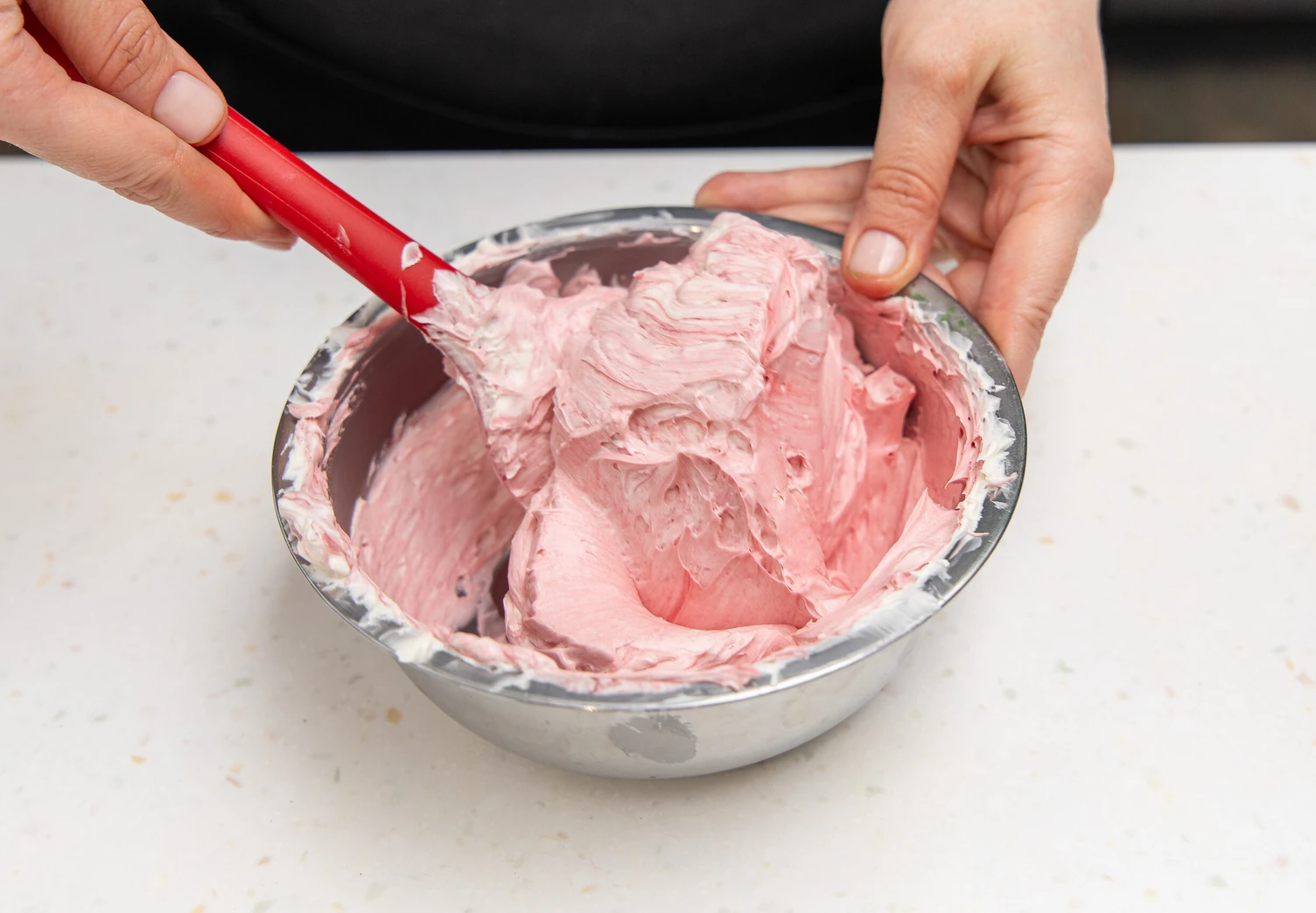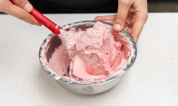 Примерно ⅔ от общего количества крема покрасьте в розовый цвет.