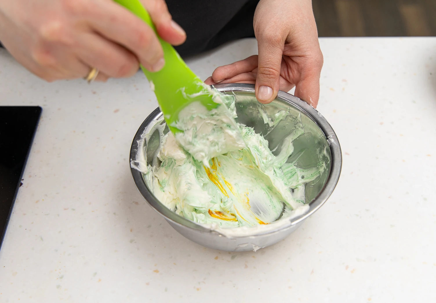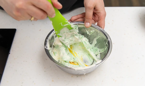 Остальное покрасьте в зелёный и переложите оба крема отдельно в кондитерские мешки. Уберите на 10–15 минут в холодильник.
