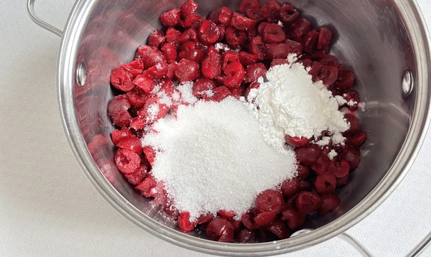 Для начинки нарежьте вишни пополам, переложите их в сотейник, добавьте сахар и кукурузный крахмал. Уваривайте начинку на среднем огне 5–6 минут до загустевания. После приготовления дайте ей полностью остыть.