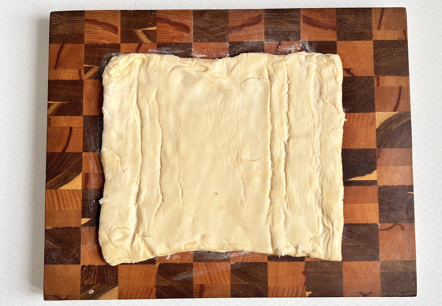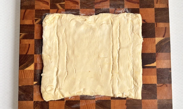 Раскатайте тесто в пласт толщиной 3-4 мм. При раскатке двигайте скалку только в одном направлении, чтобы не повредить слои.