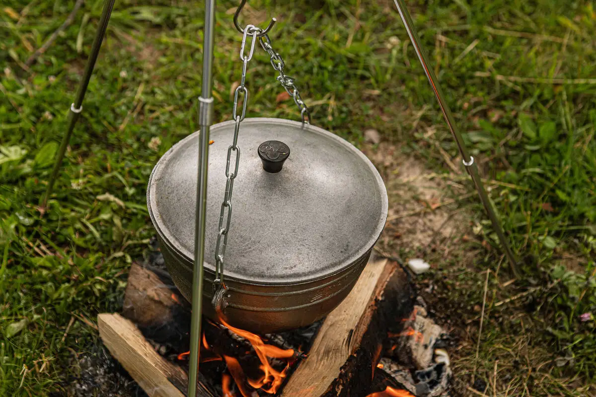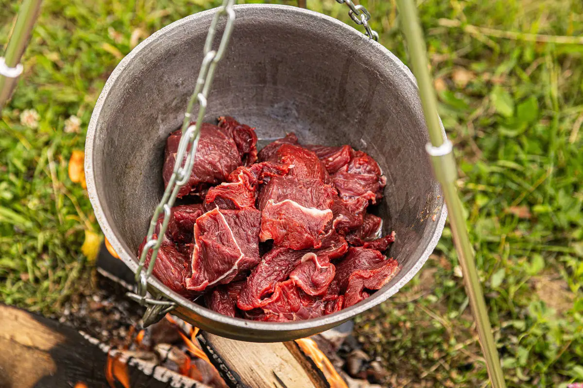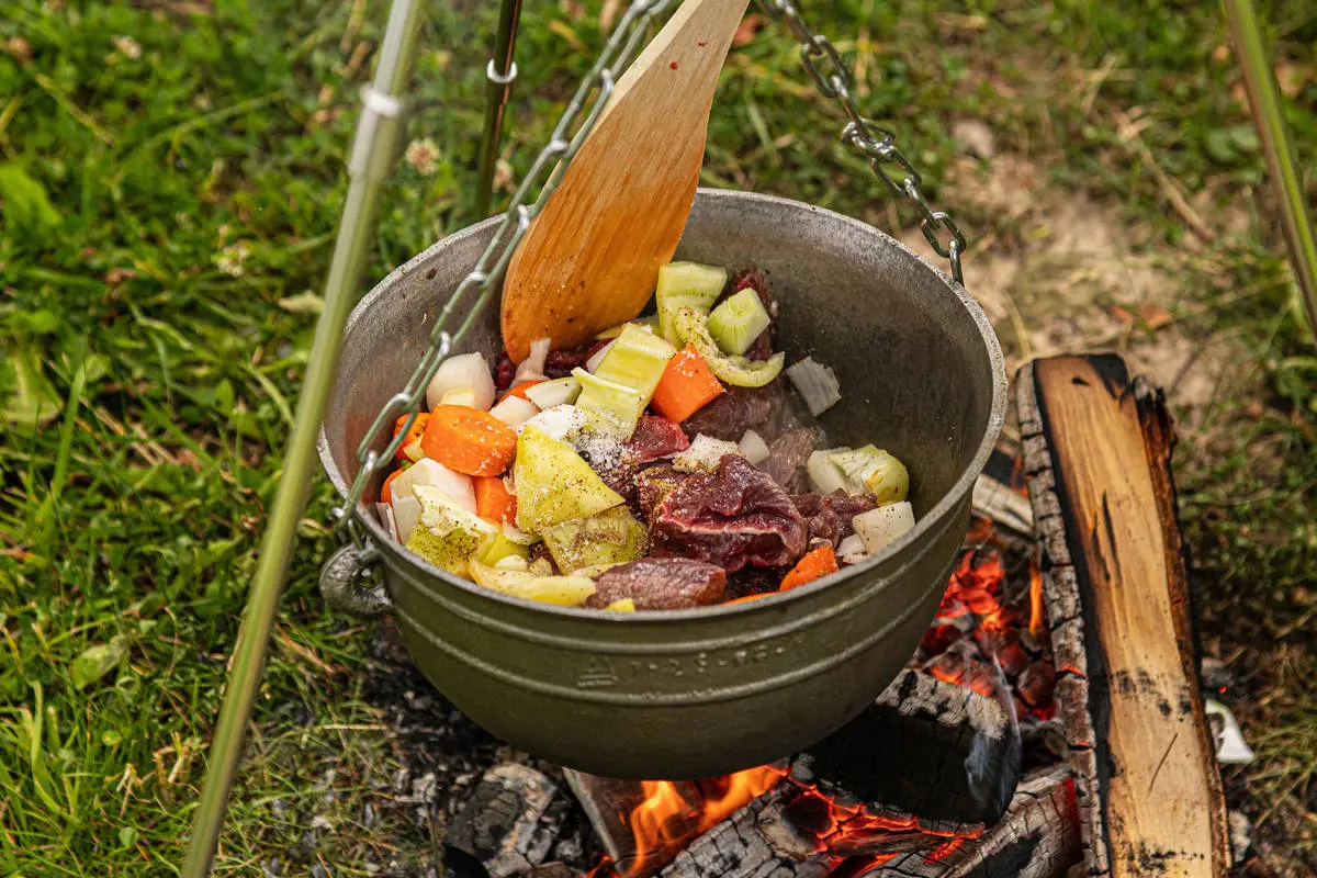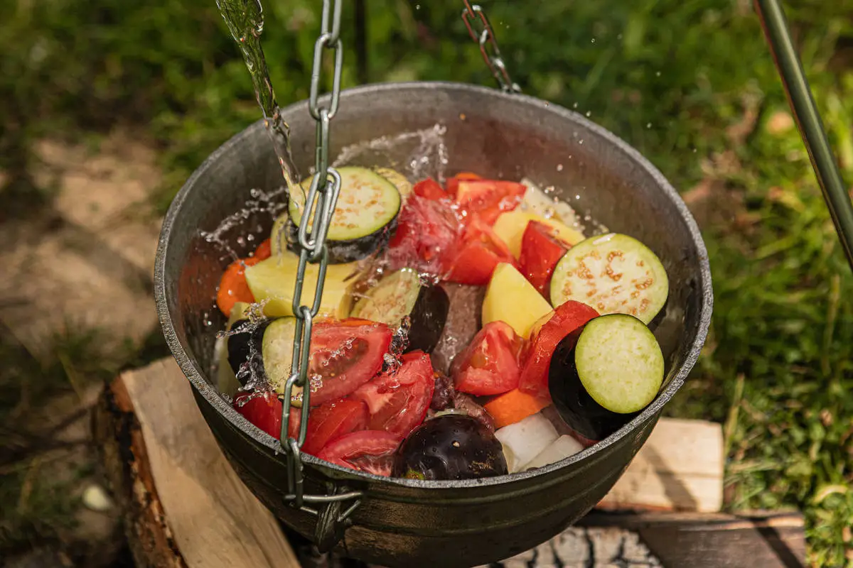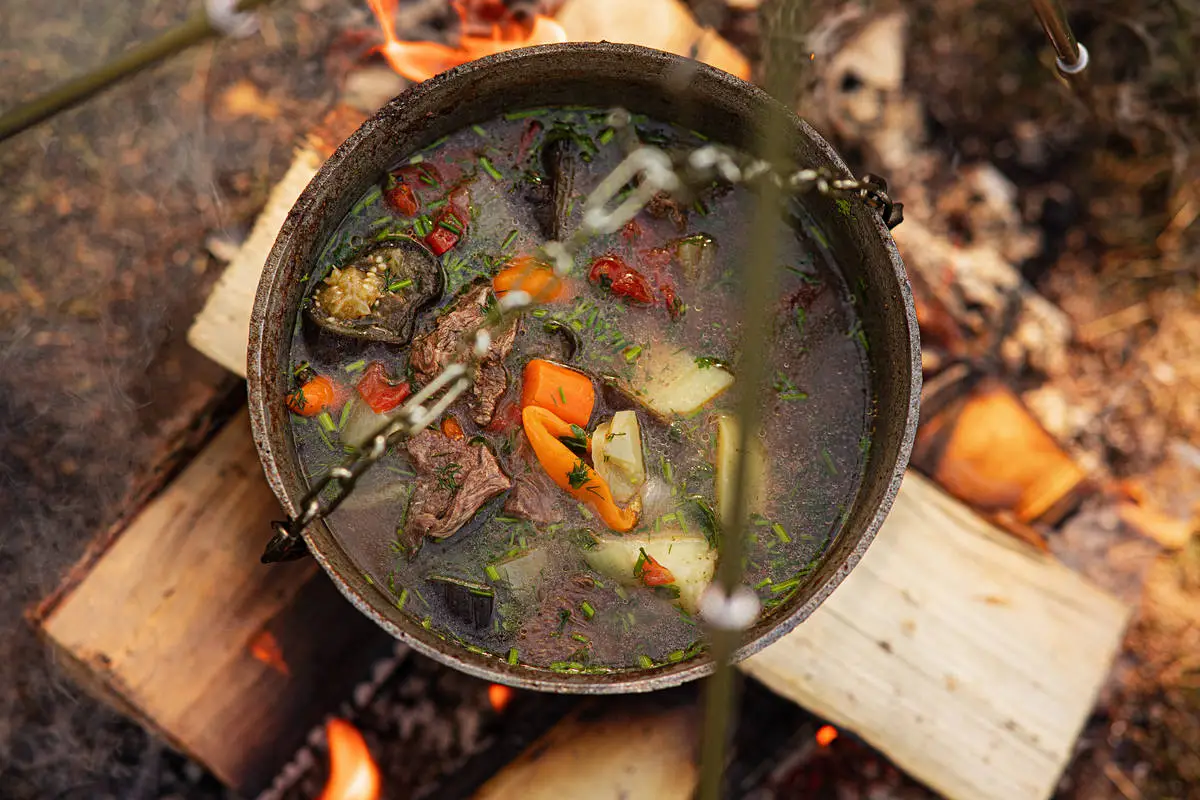 Шулюм — это густой и наваристый суп, который легко сварить на костре. Большое количество овощей и зелени делает его особенно ароматным.